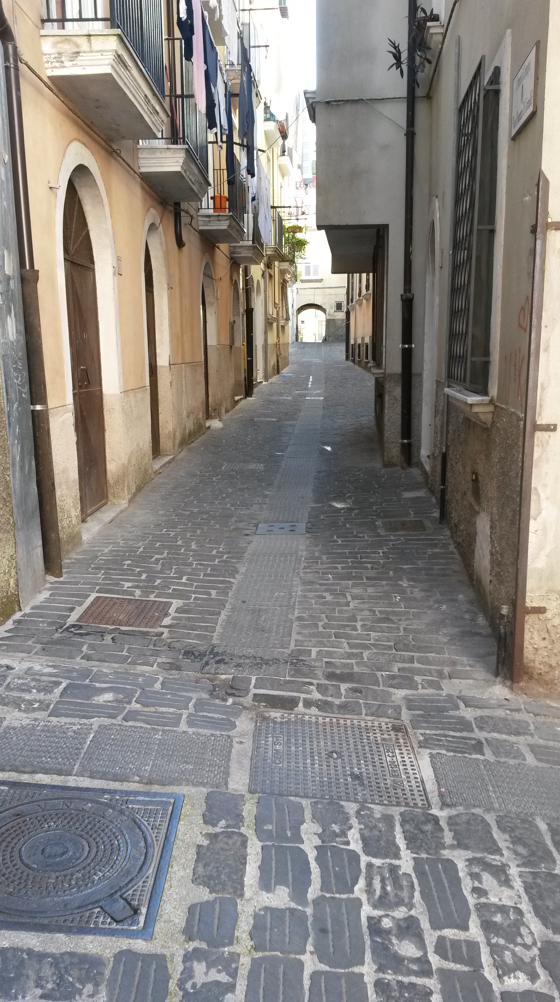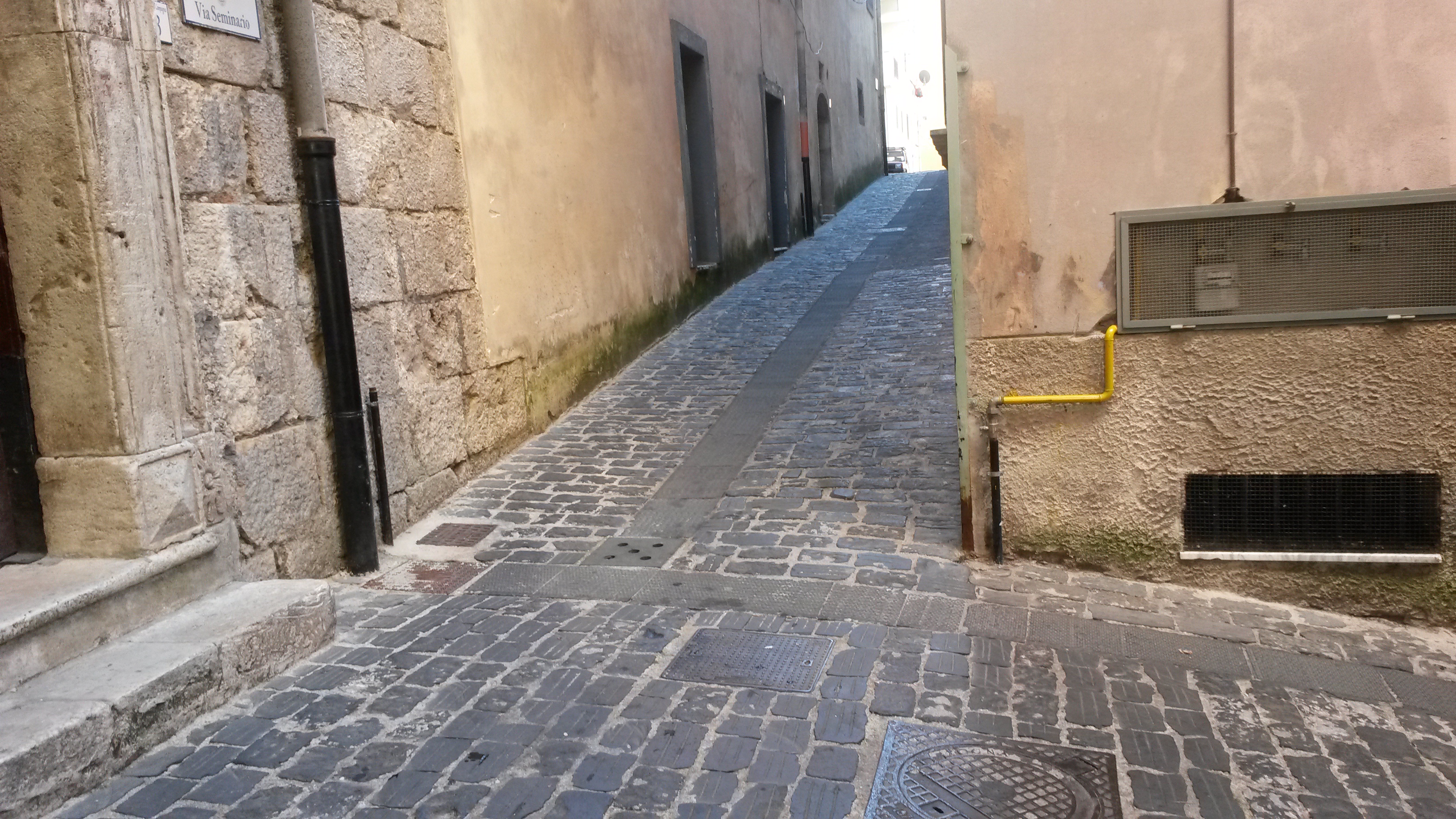 I figure Sat Nav can get us close with these coordinates, then either Plan A (the written directions) or Plan B (contact the host) will be more likely to succeed. Sat Nav had other ideas. I was led through the bowels of Campagna. Each new laneway was narrower than the last. “Surely not!” was my constant reaction. Jess had to get out of the car to check that we could fit through. Fortunately, the Peugeot has retractable side mirrors. Otherwise we would not have made it through. I am not exaggerating.