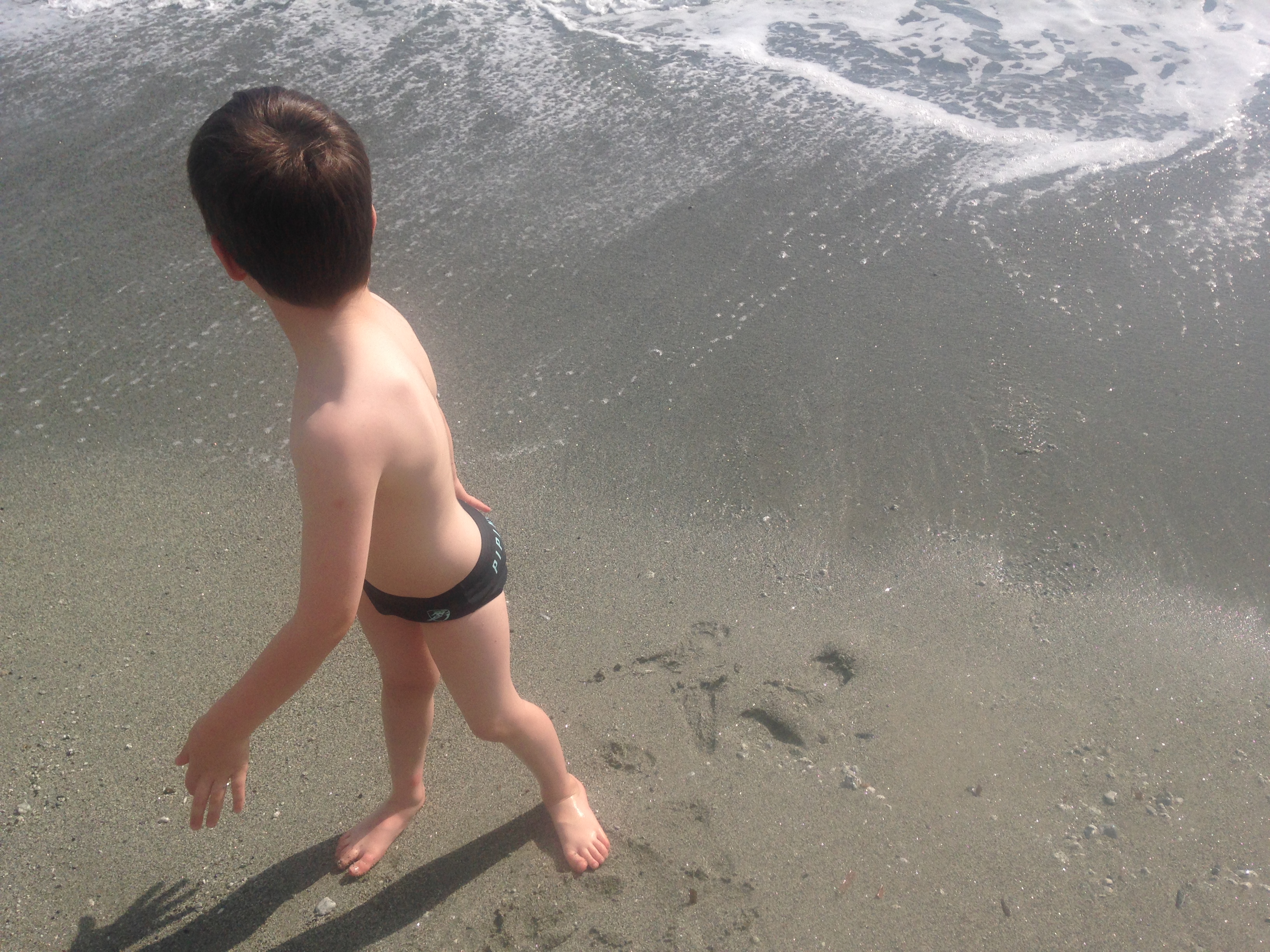We return to Monterosso, which is now very crowded. Don’t these people know it’s off season? We have lunch in a delightful restaurant over(looking) the beach. Whilst Belinda is finishing my wine, I take Hamish down to the beach, where he strips down to his speedos. It is a gorgeous day.