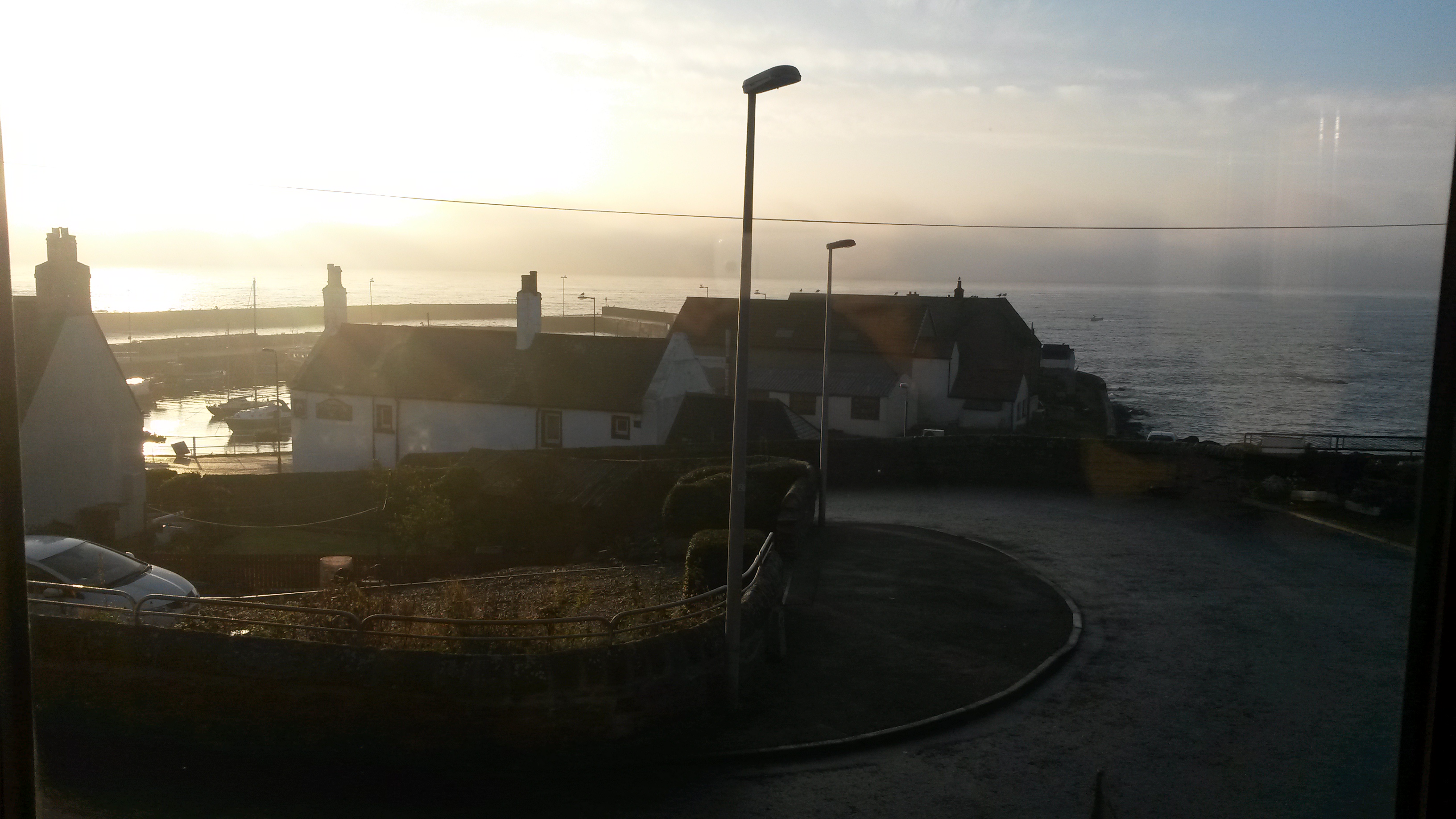 We awoke after a bit of a sleep in to bright sunshine. Scotland – who knew it would be sunny? We took a couple of photos to prove it, ate breakfast and watched the fog roll in. Never mind. We rugged up and walked up and down the coastline, did a spot of rock pool viewing and shell collecting before heading back home. The locals are very friendly and one lady kindly told us where we could take Hamish to a nearby park.