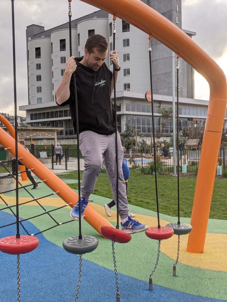 Once back at our house, I suggest we make a plan for the next couple of days. Rod’s feeling a bit dreadful (tired?) so the rest of us take Hamish to an adventure playground, which I have to say, is pretty cool. We all play on the equipment and Jess decides it would be a good place for her to practice her roller-skating.