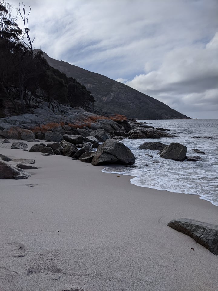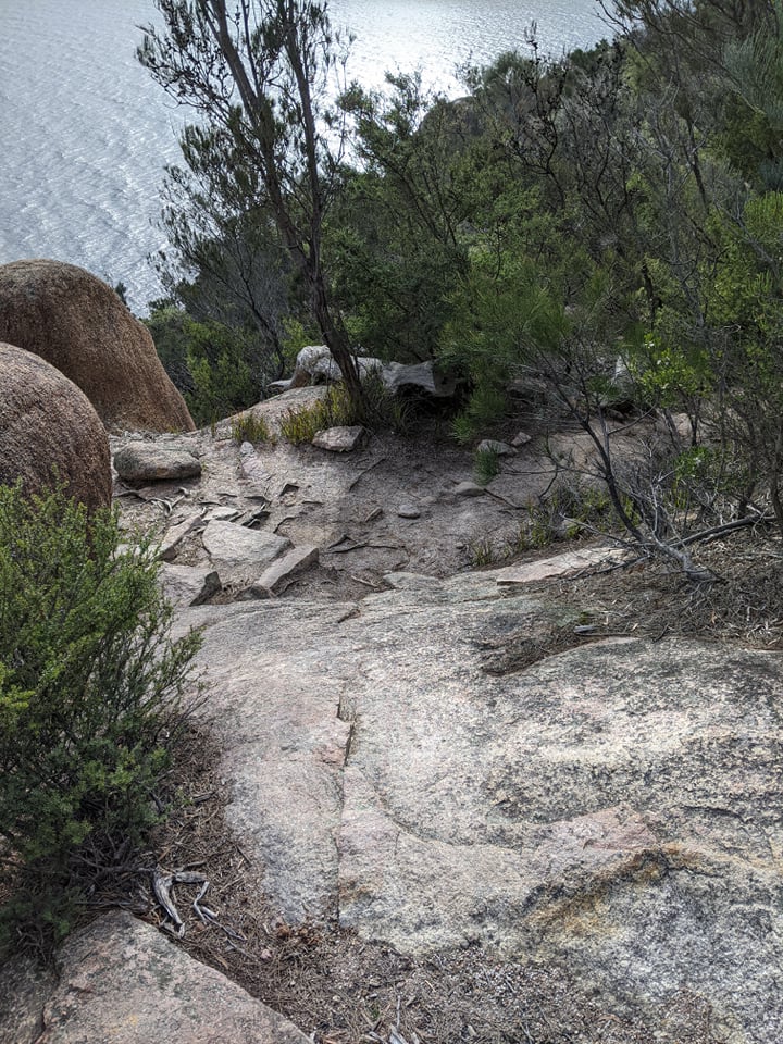The ‘children’ drop us off at the start of the walk and we loosely talk about plans to pick us up later at the Freycinet Lodge. I have talked Rod into doing the Wine Glass Bay – Hazards Bay loop which is about 11km. The attendant at the Information Centre tells us the suggested time for this loop is 5 hours, and I quote, “at a leisurely pace” – she tells us she’s done it in 3 hours before. I love her for this. There is no leisurely pace when I walk anywhere, so I’m very pleased to say we smashed this ‘recommended time’ by 2 hours.