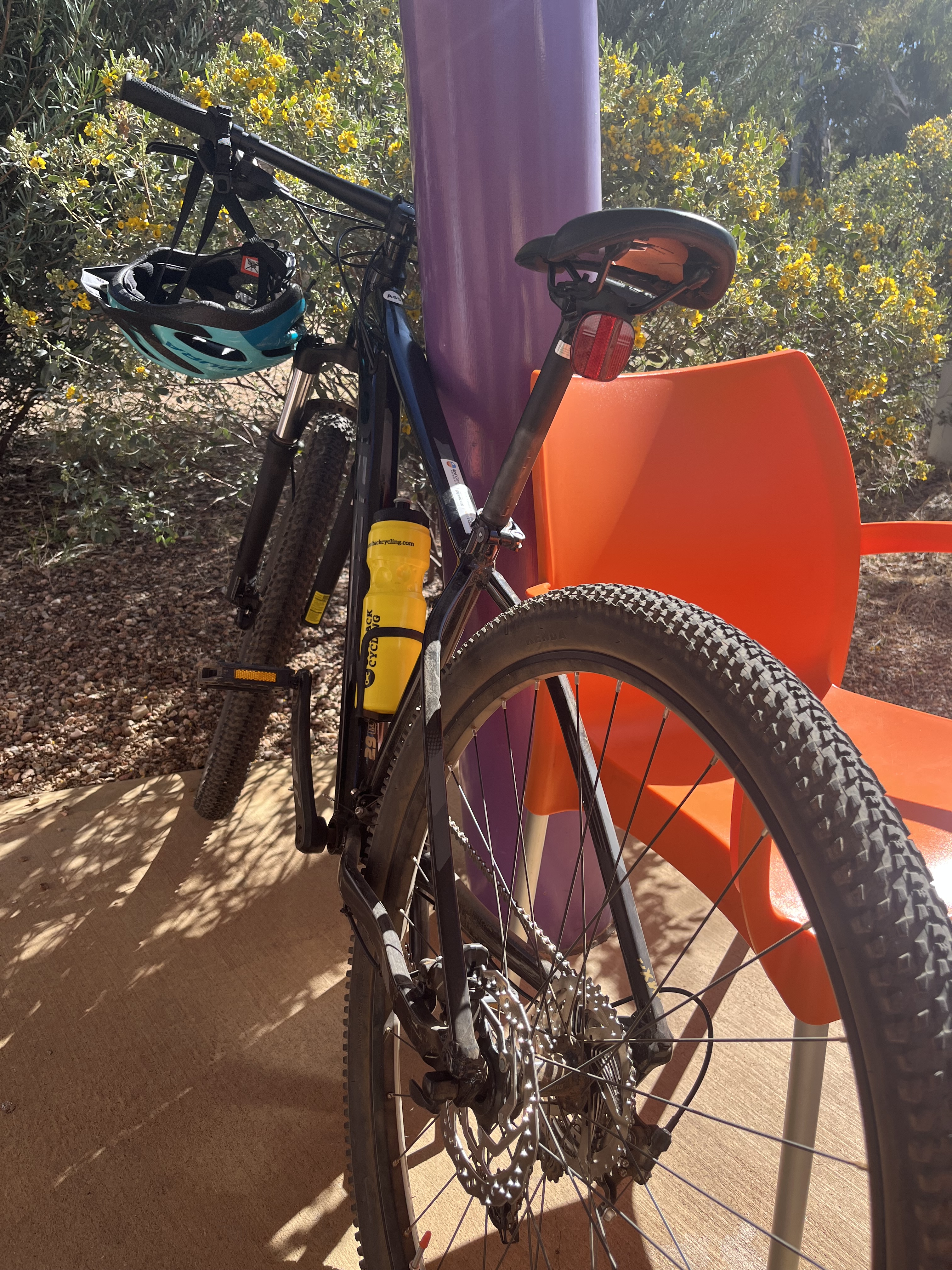 This ride is incredible in that, the views are amazing: blue skies and red rocks as far as the eye can see. Loved every minute (even the uphill) and it’s felt good being back on the bike this week. Rod stopped for a nature break on the way back and found a bike stashed behind a tree. Stolen? Cross training? Weird regardless.