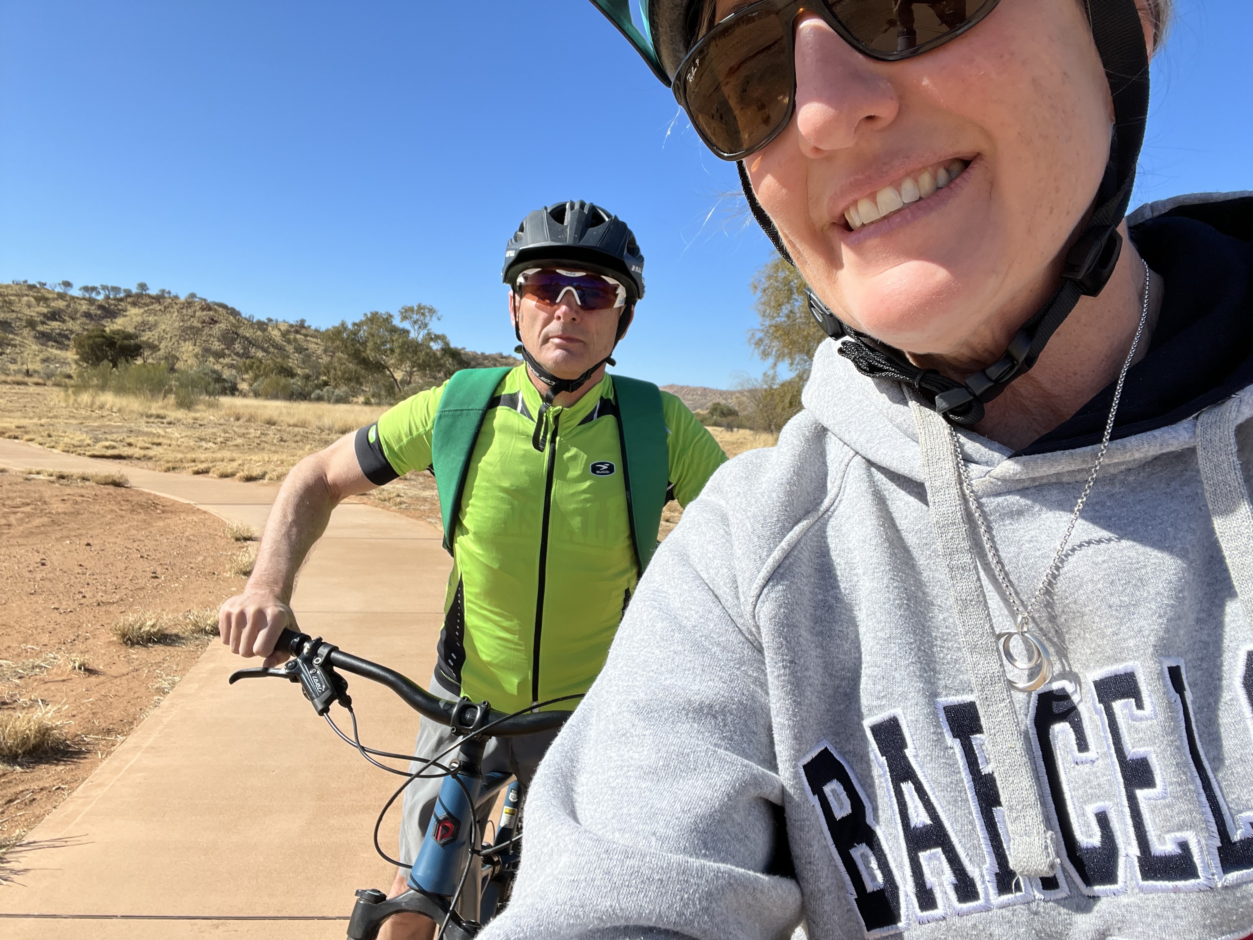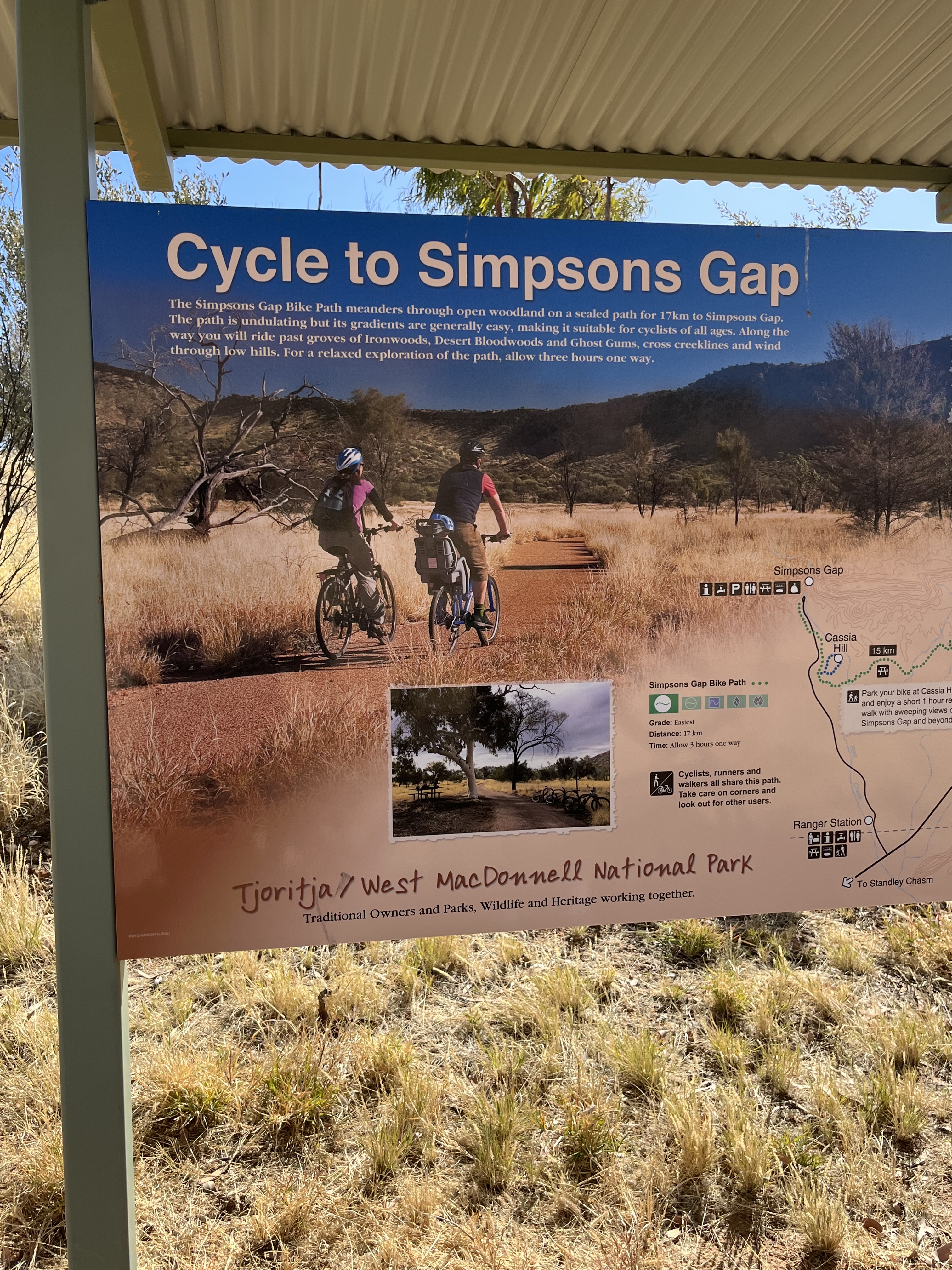 After a night of catching up with friends around Michelle and Stewart’s fire pit, with slightly foggy heads, Rod and I planned a bike ride towards Simpson’s Gap. I say ‘toward’ – whilst we would have made it TO Simpson’s Gap, our pleasant ride would then have turned into a 50K + return. I was VERY aware of the ever so slight downhill vibe I was getting. Where there’s downhill there’s uphill…