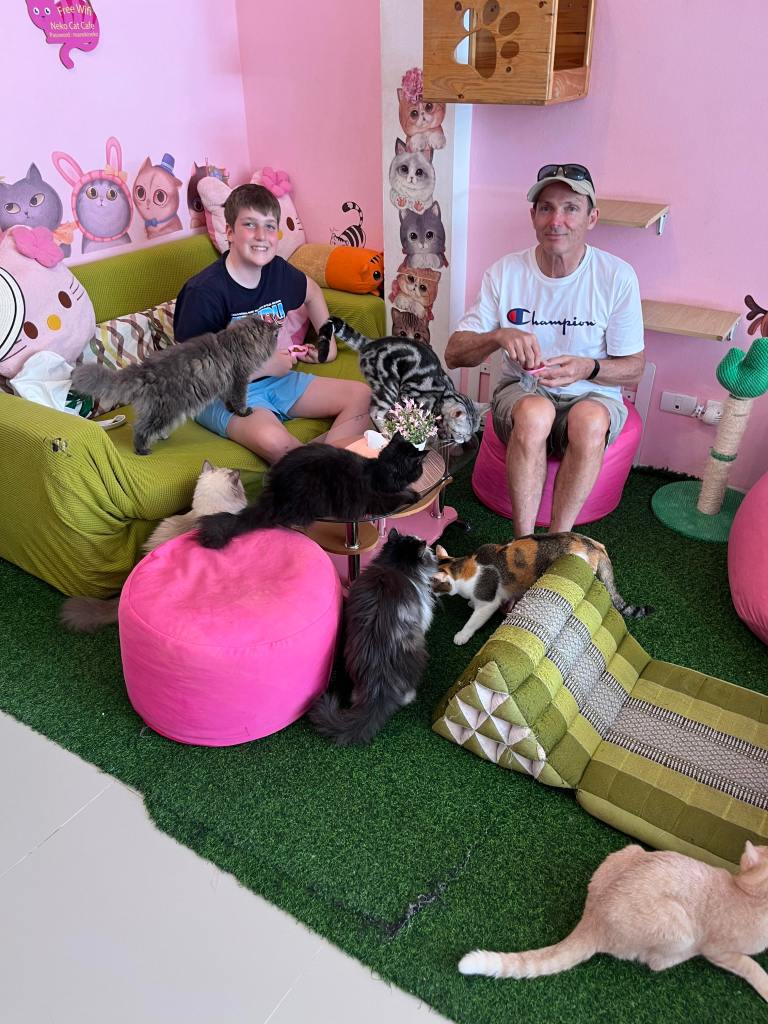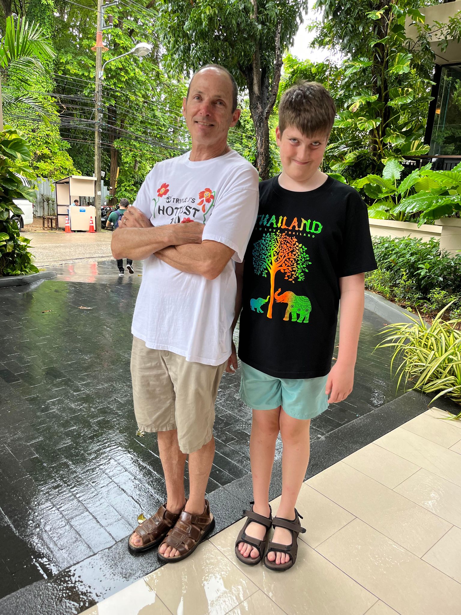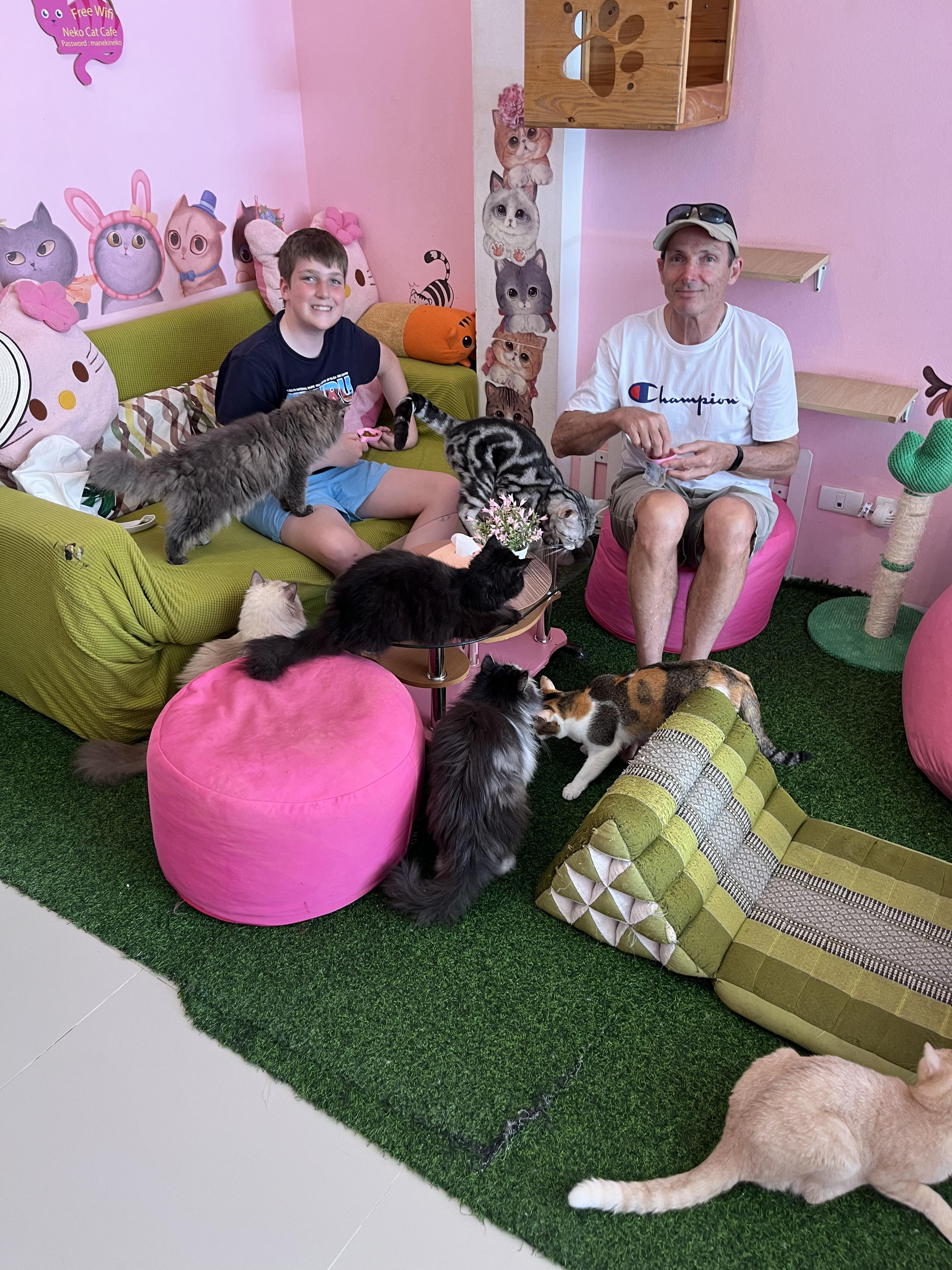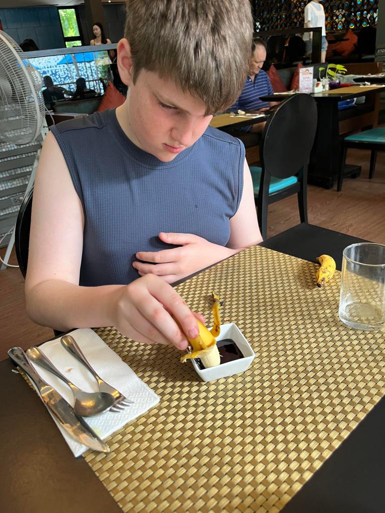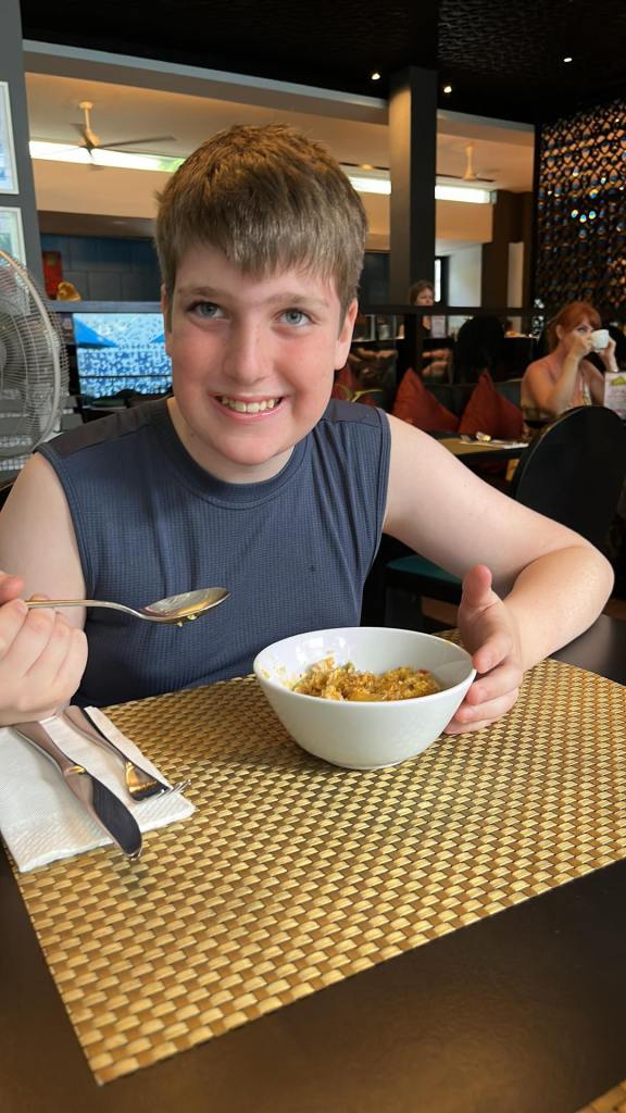 I am currently sitting in the lobby of the hotel, having checked out at midday for a 2pm transfer to the airport. Our flight to Singapore leaves at 615pm (or 915pm AEST) and we have a bit of a long layover in Singapore before our flight leaves for Melbourne. We are due to arrive just before midday. Thankfully it’s coolish today and has rained a few times. Hamish is spending the last of his hours in the pool with Rod supervising. There’s an outdoor shower which he can have before chucking out his old rashy and baggy swimmers before getting dressed.