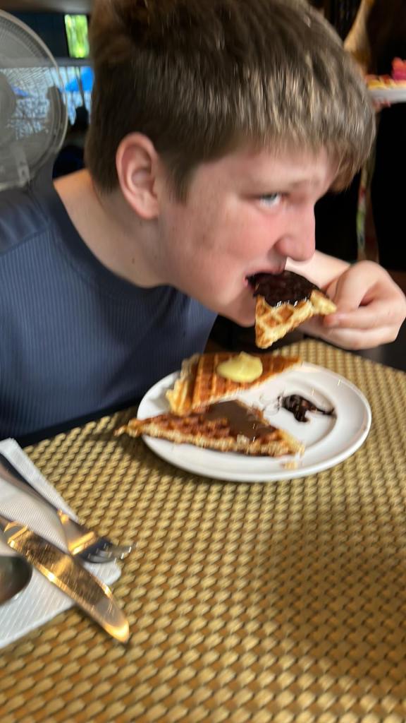 I do not want to burden Hamish with my failing health, but surreptitiously try to slow the pace down and suggest we try to explore some of the other “lands” of this park. The lazy river slows things down suitably, as does the wave pool (before the waves kick in at 2 pm.)