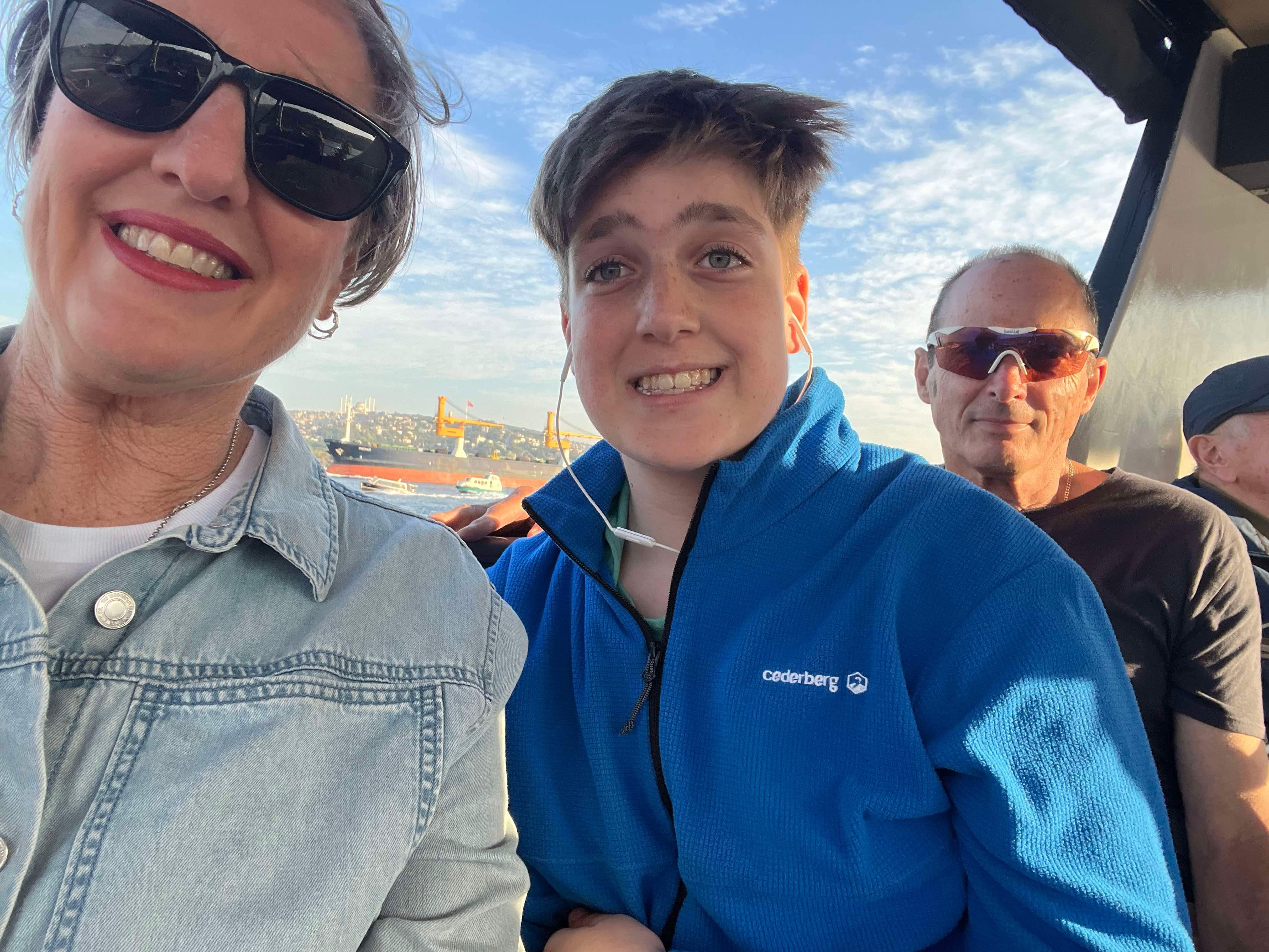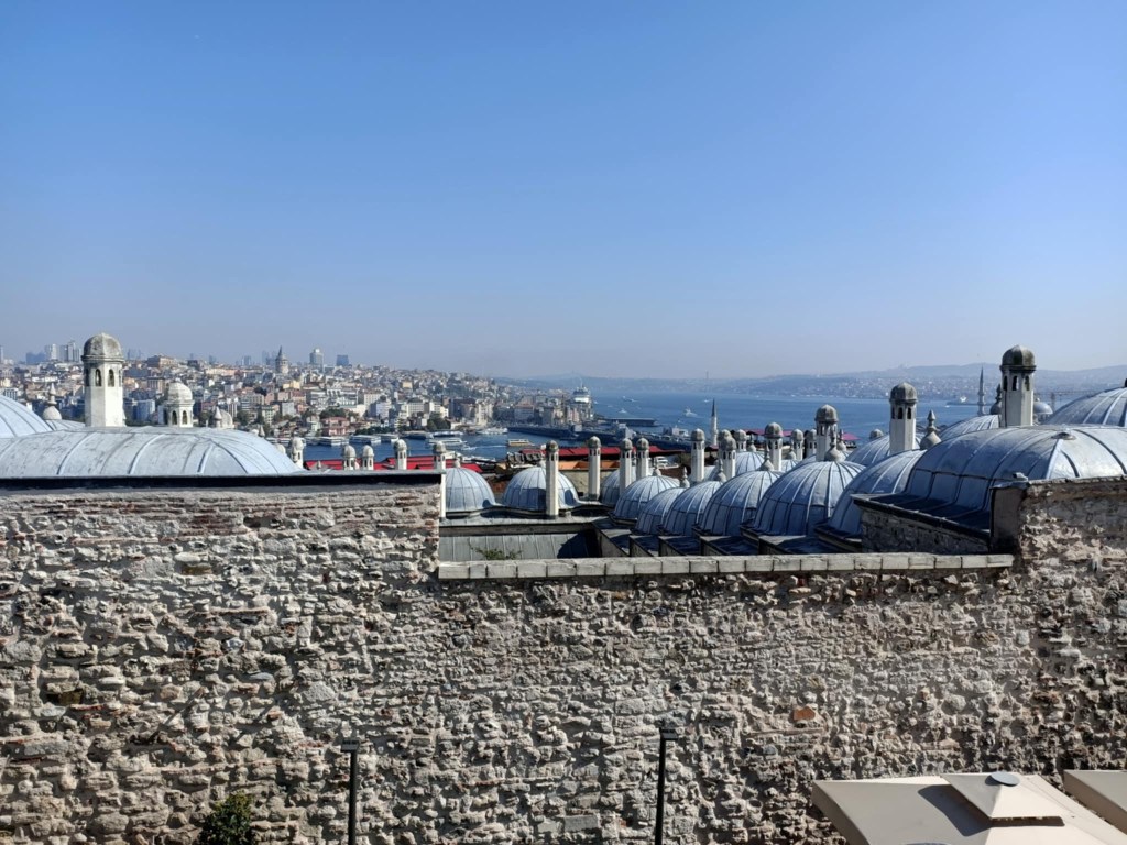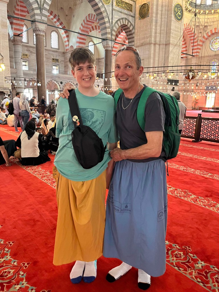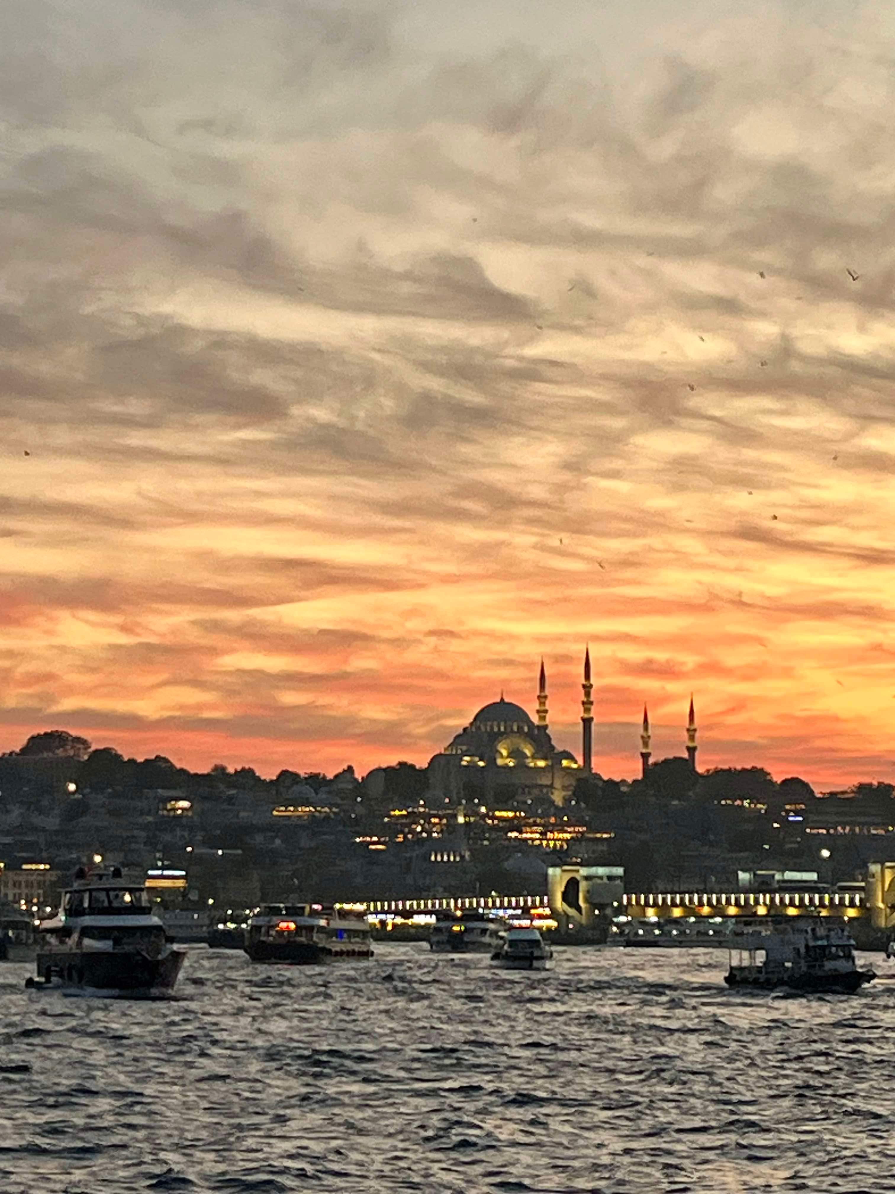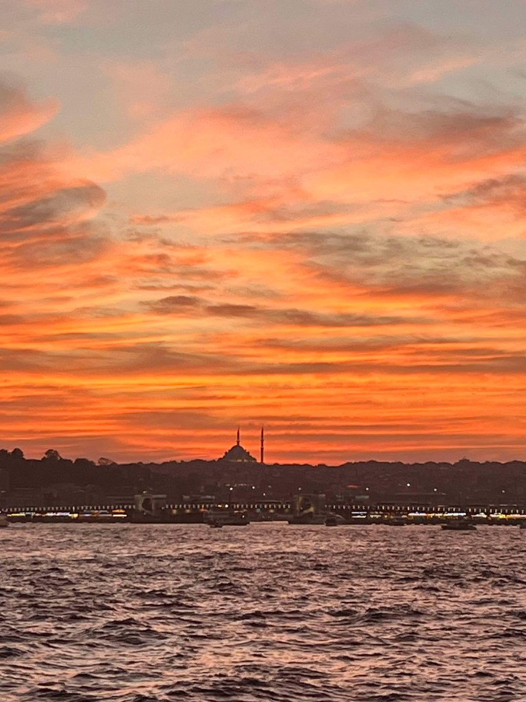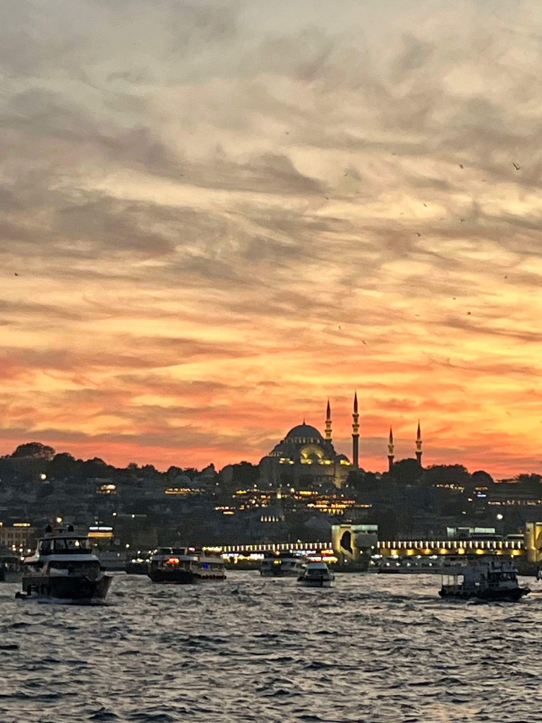 Saturday we decided to visit Suleymmaniye Mosque (little sister of the more famous Blue Mosque) and walk around the Grand Bazaar. The mosque was beautiful and the views over Istanbul impressive. We needed to cover our legs (all 3 of us) and I put on a head scarf. After the mosque, I got us a bit lost, so we didn’t manage to find the Bazaar. Never mind, we headed home for an afternoon rest as we had booked a Bosphorus sunset cruise for the evening.