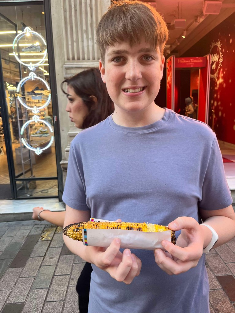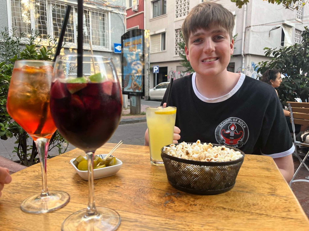 Friday night after our ‘day off’ we walked up to Taksim square and had a look around. We really like Taksim Square – it’s got a great vibe, there’s a lot of walking space with no traffic, there’s parks and gardens and of course, lots of things to eat. You may have seen the Turkish Ice Cream vendor video with Hamish (that was in Taksim). We walked down the famous Istiklal street where Hamish had corn from a street vendor for the cost of 50 cents! We eventually sauntered back to our street, where we had dinner at Cafe Susam and where Rod finally could order a glass of wine!