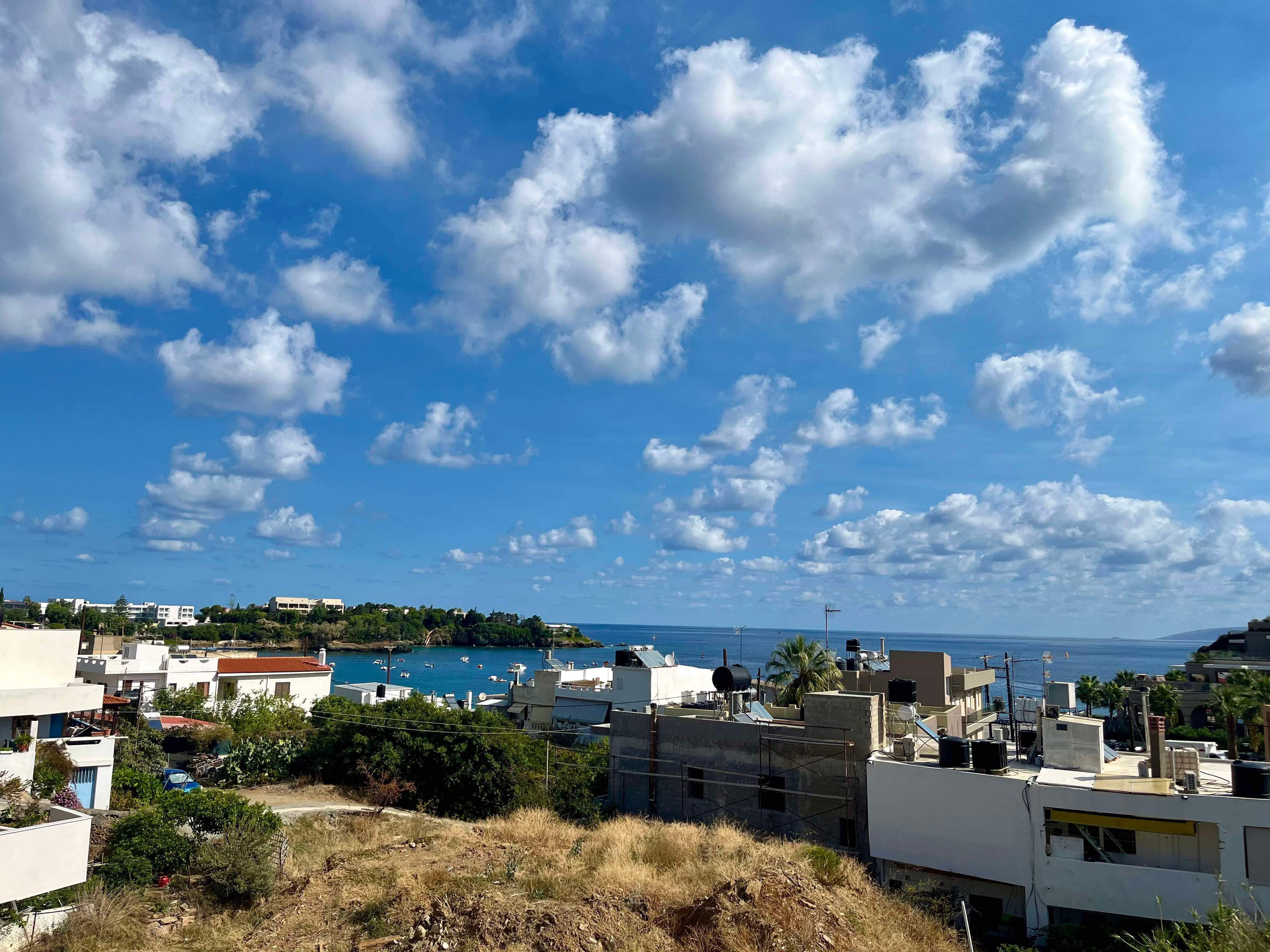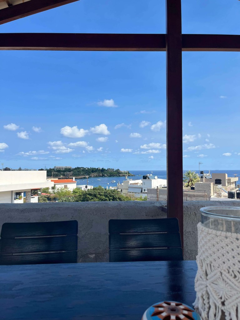 I’m currently sitting on the rooftop undercover area of our apartment in a small seaside village in Crete called Agia Pelagia. We’re here until Saturday and we’re in beachside holiday mode, brought on mostly by the weather, the proximity to the sea and the bottle of duty-free gin Rod purchased at Athens airport.