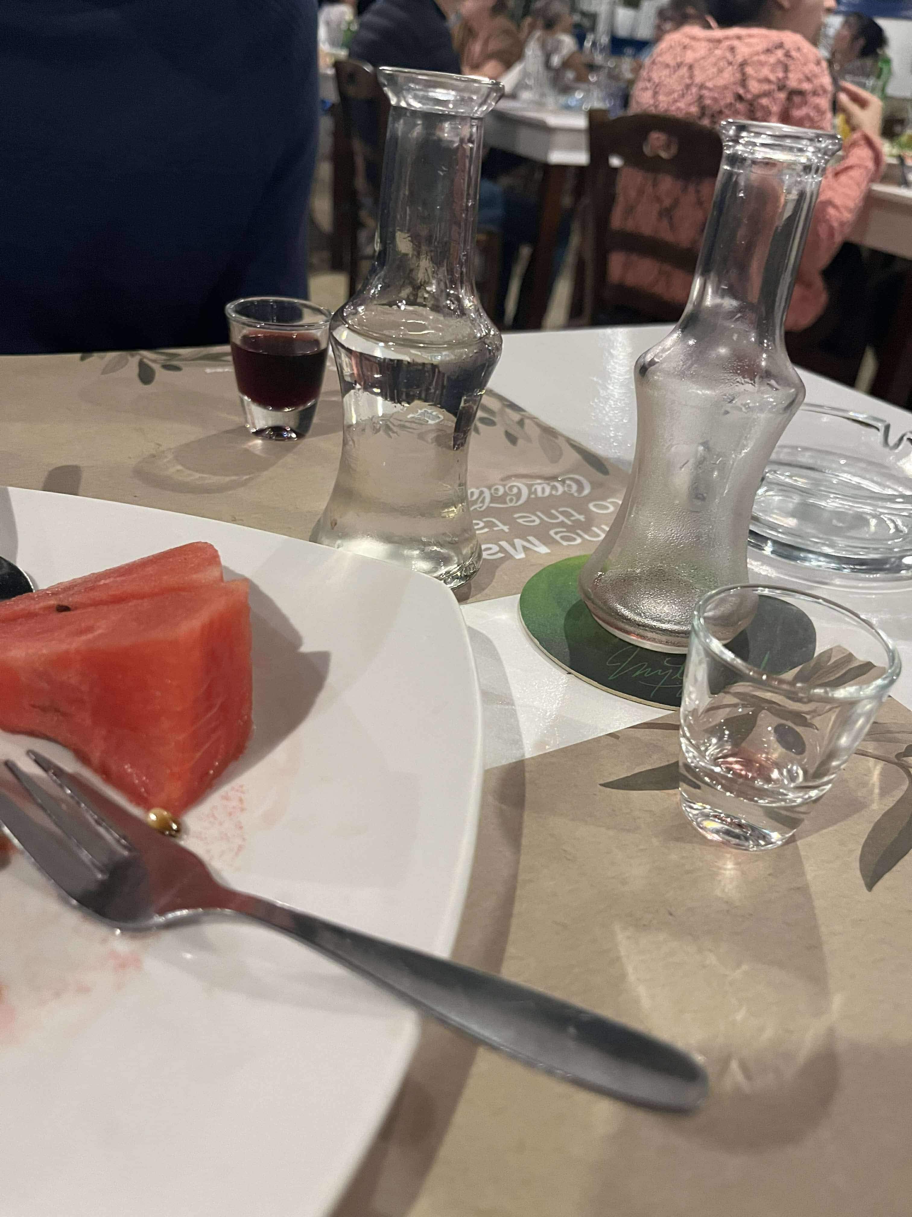 Dining Out. After dinner, the waiters bring you either a free dessert (we’ve had ice-cream and chocolate sauce with 3 x spoons and something like a walnut and carrot cake with ice-cream and 3 x spoons) OR fresh fruit and raki. Raki is made from distilled grapes and aniseed and is somewhere between 40-50% alcohol!