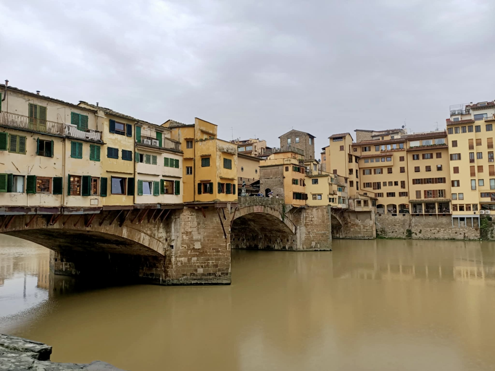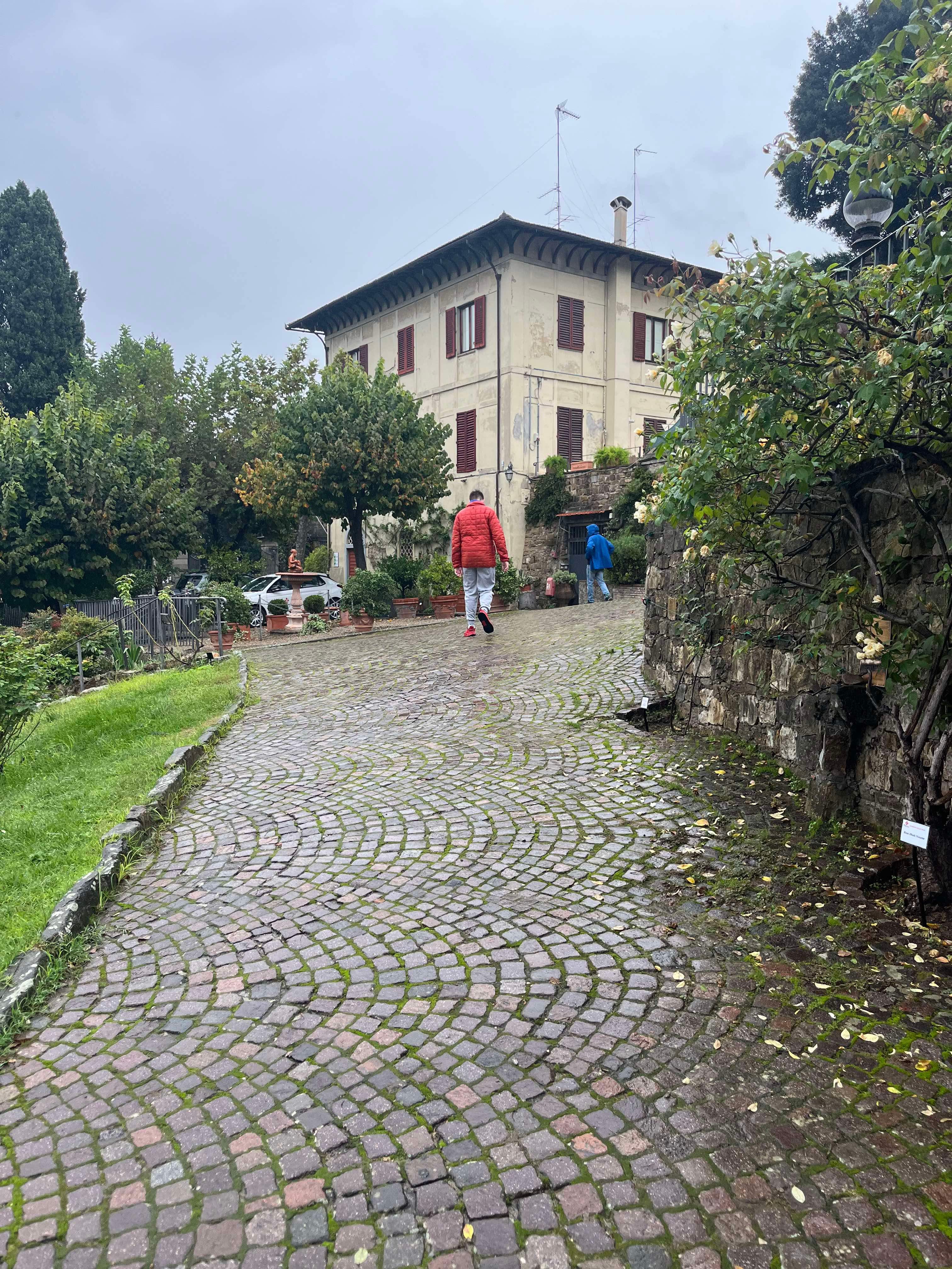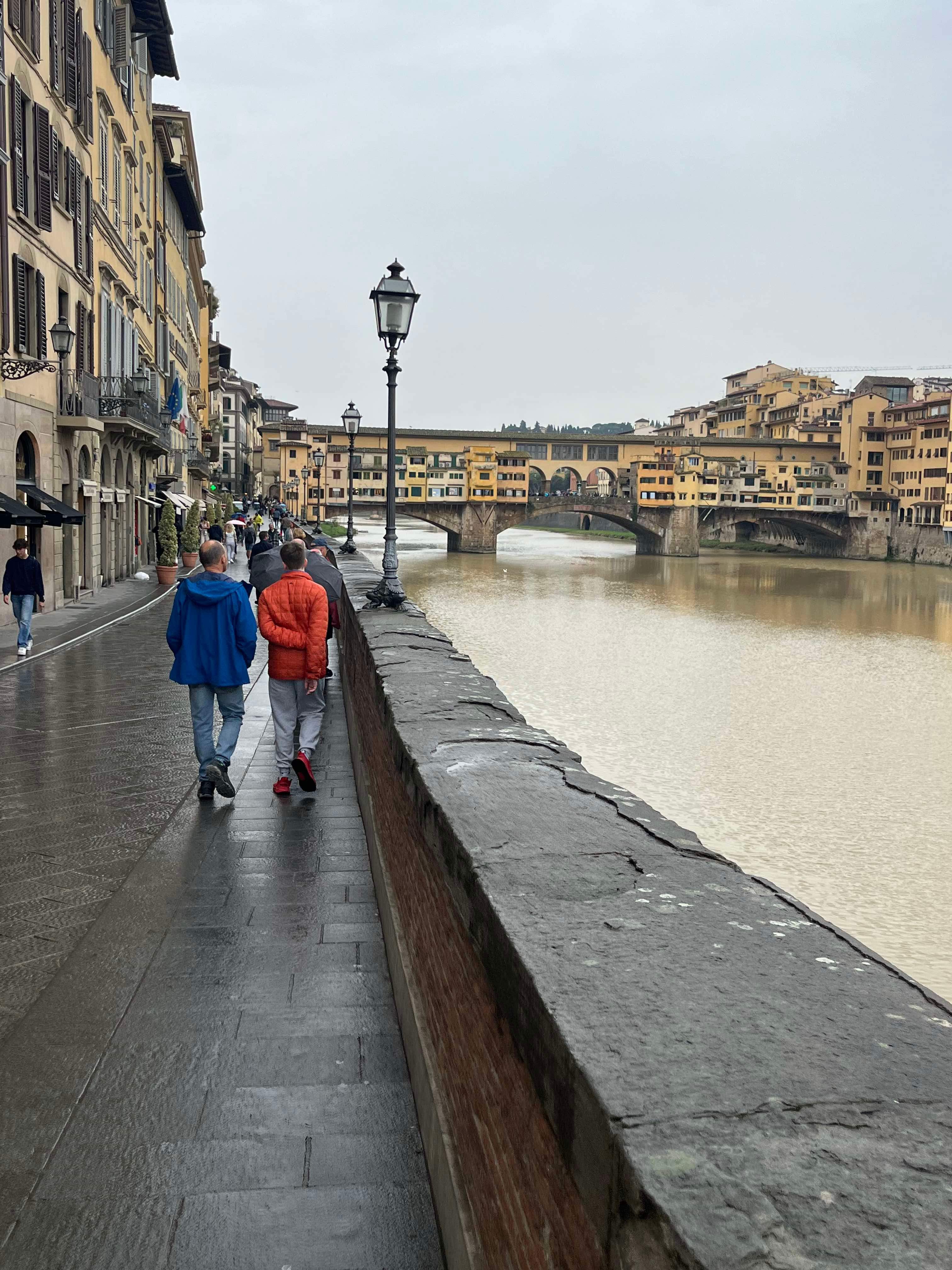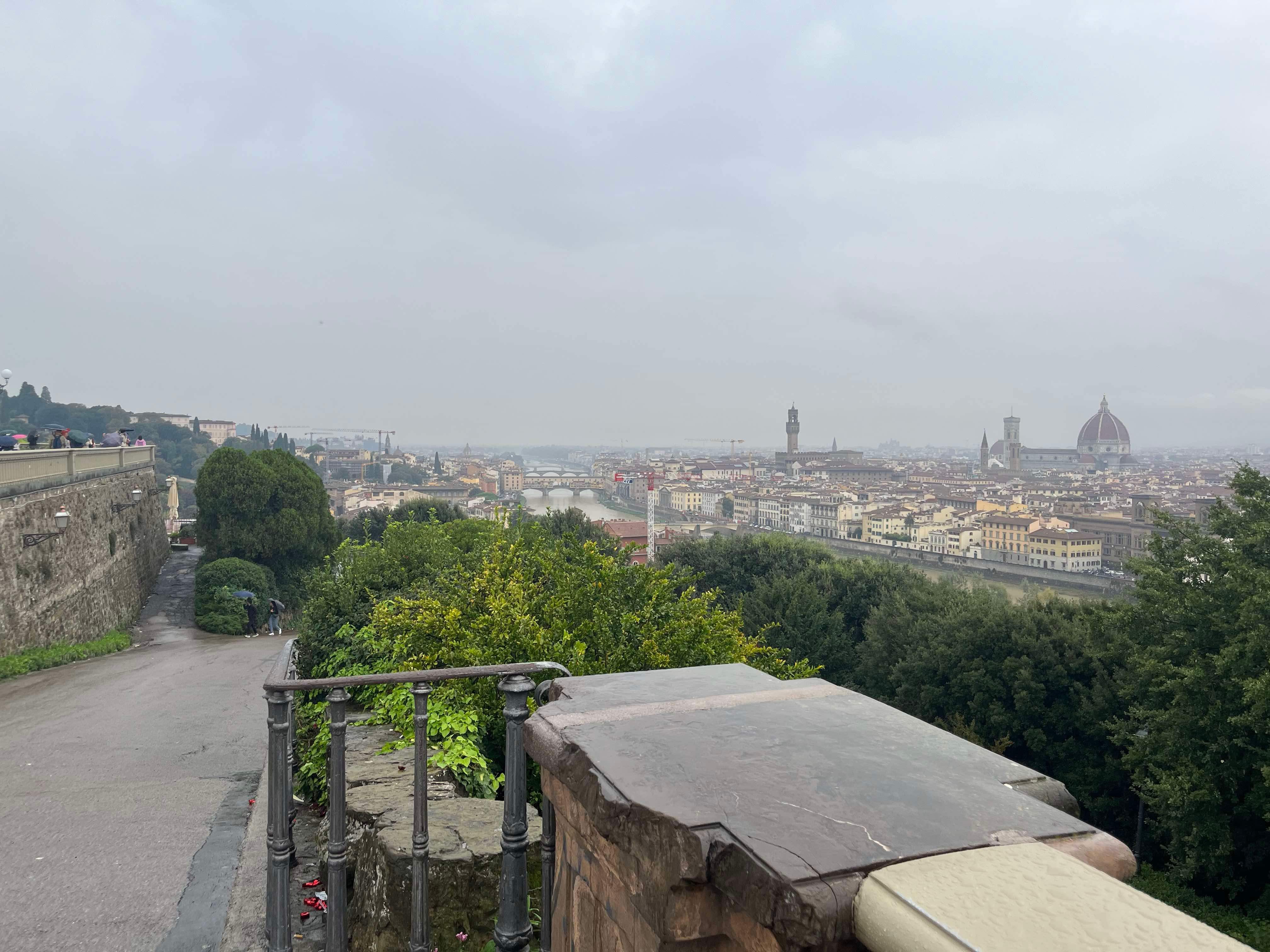 During our stay, we successfully attempted two day trips to Florence, catching the train from Sieci which was a 10 minute drive from our village. On our first day in Florence, we headed to the famous Ponte Vecchio which spans the Arno River. We had a basic (but expensive) lunch and walked across the bridge and then headed to the Michaelangelo Pallazo (the highest lookout in Florence). At this point in time, it was a bit drizzly, but not too bad. I had an umbrella, Rod had his waterproof jacket and Hamish had his puffy. I tried to share my umbrella with Hamish, but this was tricky on the narrow paths. The weather was 20-ish degrees, so we were sweaty as well as being rain drenched – such a lovely combination. Once at the lookout, there wasn’t much to see due to the grey skies, drizzle and cloud cover, so we looked for a toilet (it was closed) and then the heavens decided to really open up. We made our way into a very flash hotel for some afternoon tea and plan our escape back to Santa Brigida – no taxis, no buses…it was looking like we were going to have to walk in the pouring rain, but then at the last minute, a taxi dropped off a couple and we jumped in.