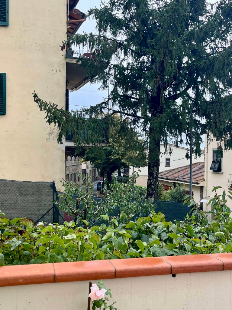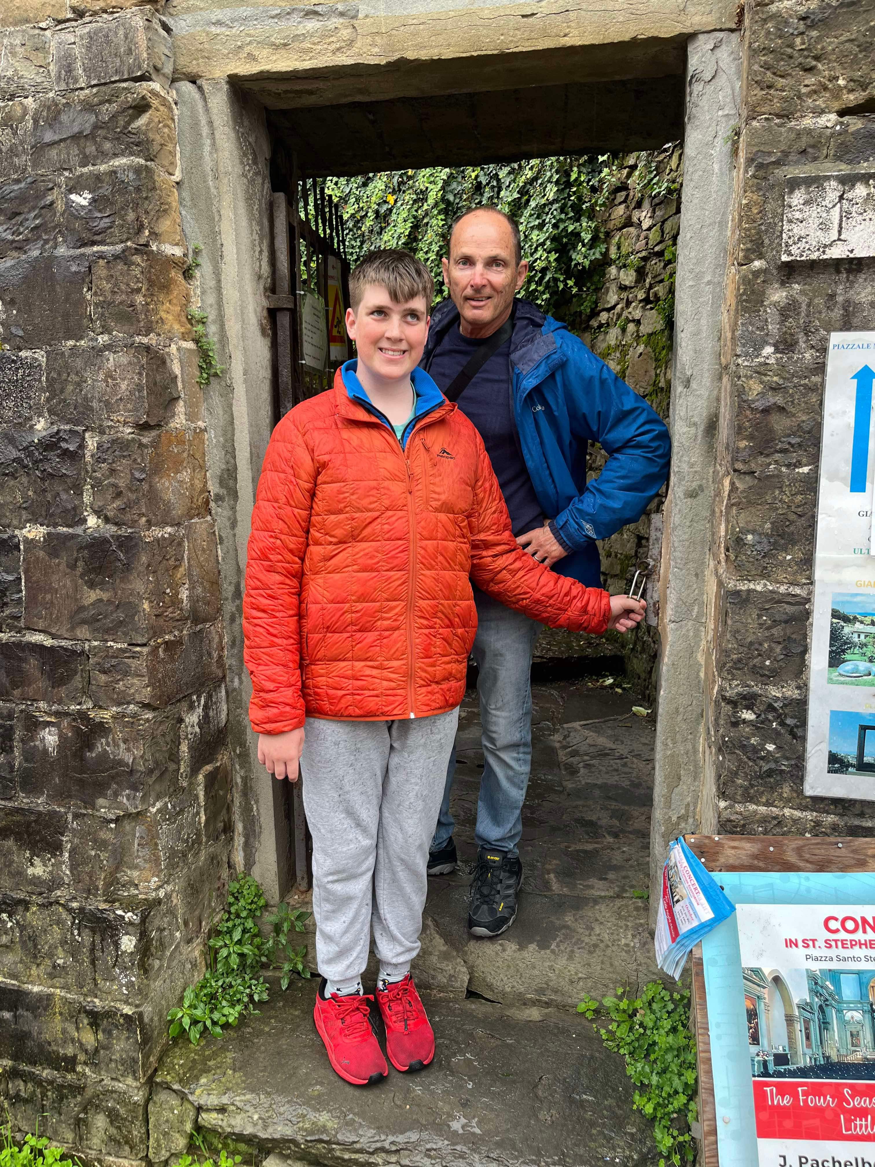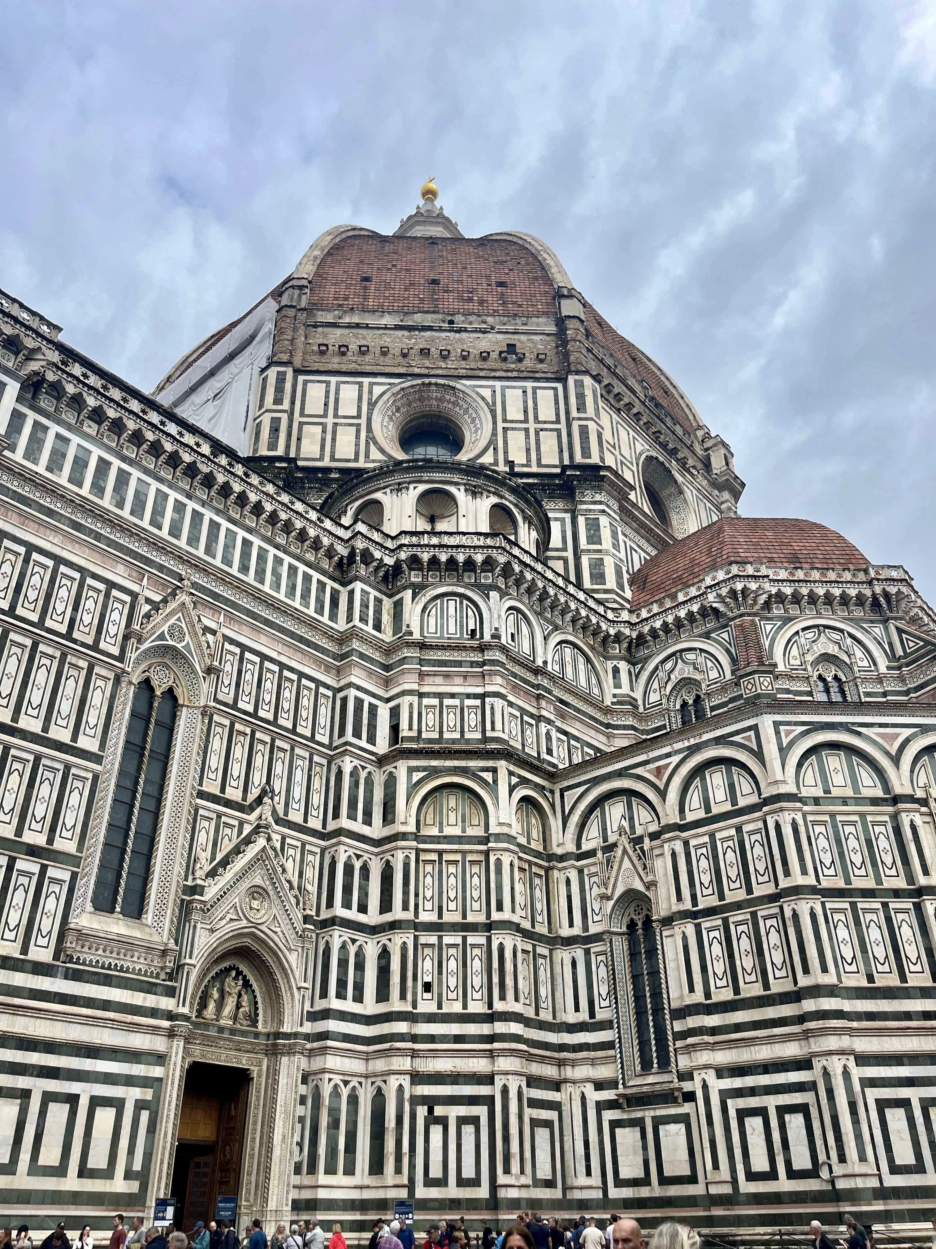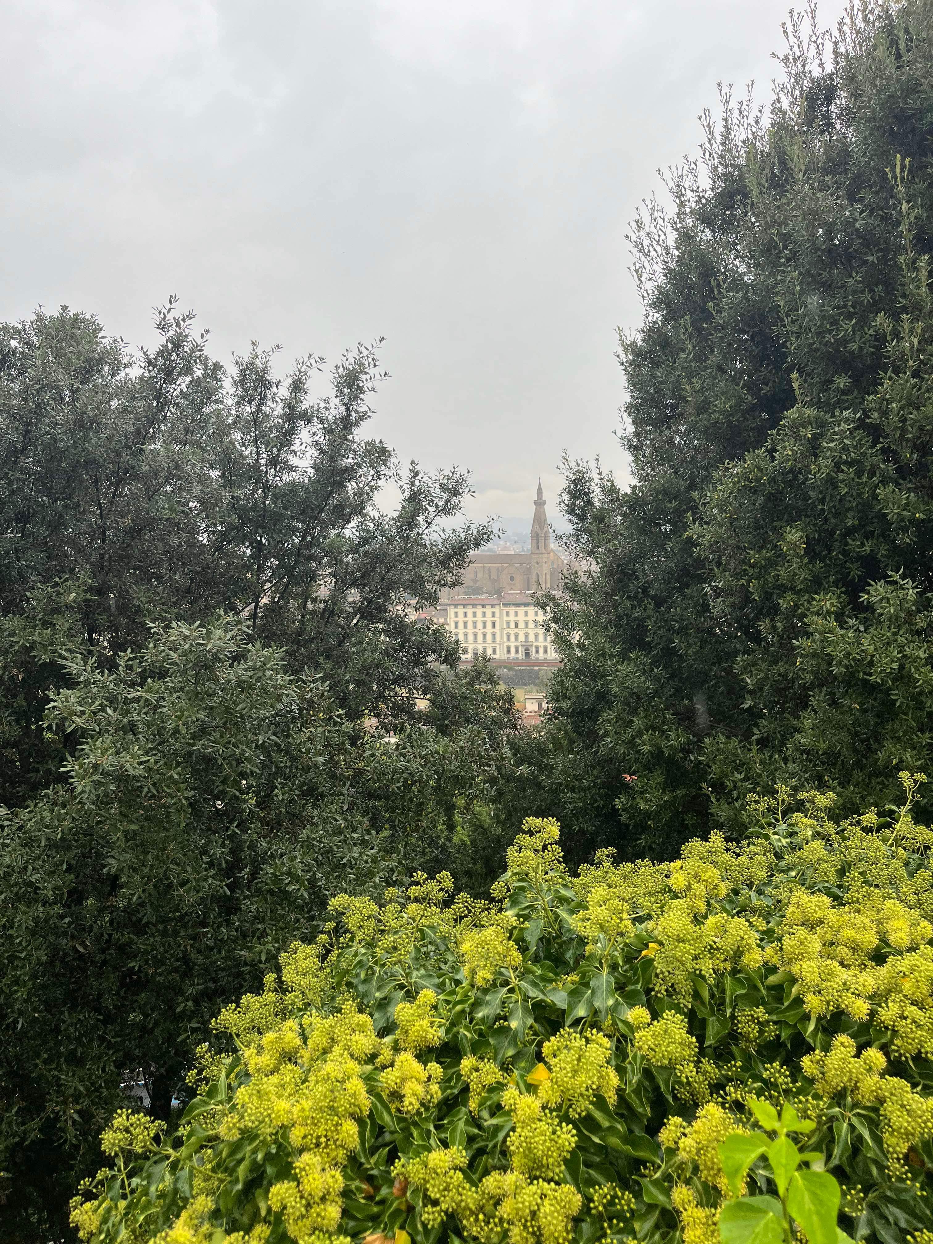 During our stay, we successfully attempted two day trips to Florence, catching the train from Sieci which was a 10 minute drive from our village. On our first day in Florence, we headed to the famous Ponte Vecchio which spans the Arno River. We had a basic (but expensive) lunch and walked across the bridge and then headed to the Michaelangelo Pallazo (the highest lookout in Florence). At this point in time, it was a bit drizzly, but not too bad. I had an umbrella, Rod had his waterproof jacket and Hamish had his puffy. I tried to share my umbrella with Hamish, but this was tricky on the narrow paths. The weather was 20-ish degrees, so we were sweaty as well as being rain drenched – such a lovely combination. Once at the lookout, there wasn’t much to see due to the grey skies, drizzle and cloud cover, so we looked for a toilet (it was closed) and then the heavens decided to really open up. We made our way into a very flash hotel for some afternoon tea and plan our escape back to Santa Brigida – no taxis, no buses…it was looking like we were going to have to walk in the pouring rain, but then at the last minute, a taxi dropped off a couple and we jumped in.