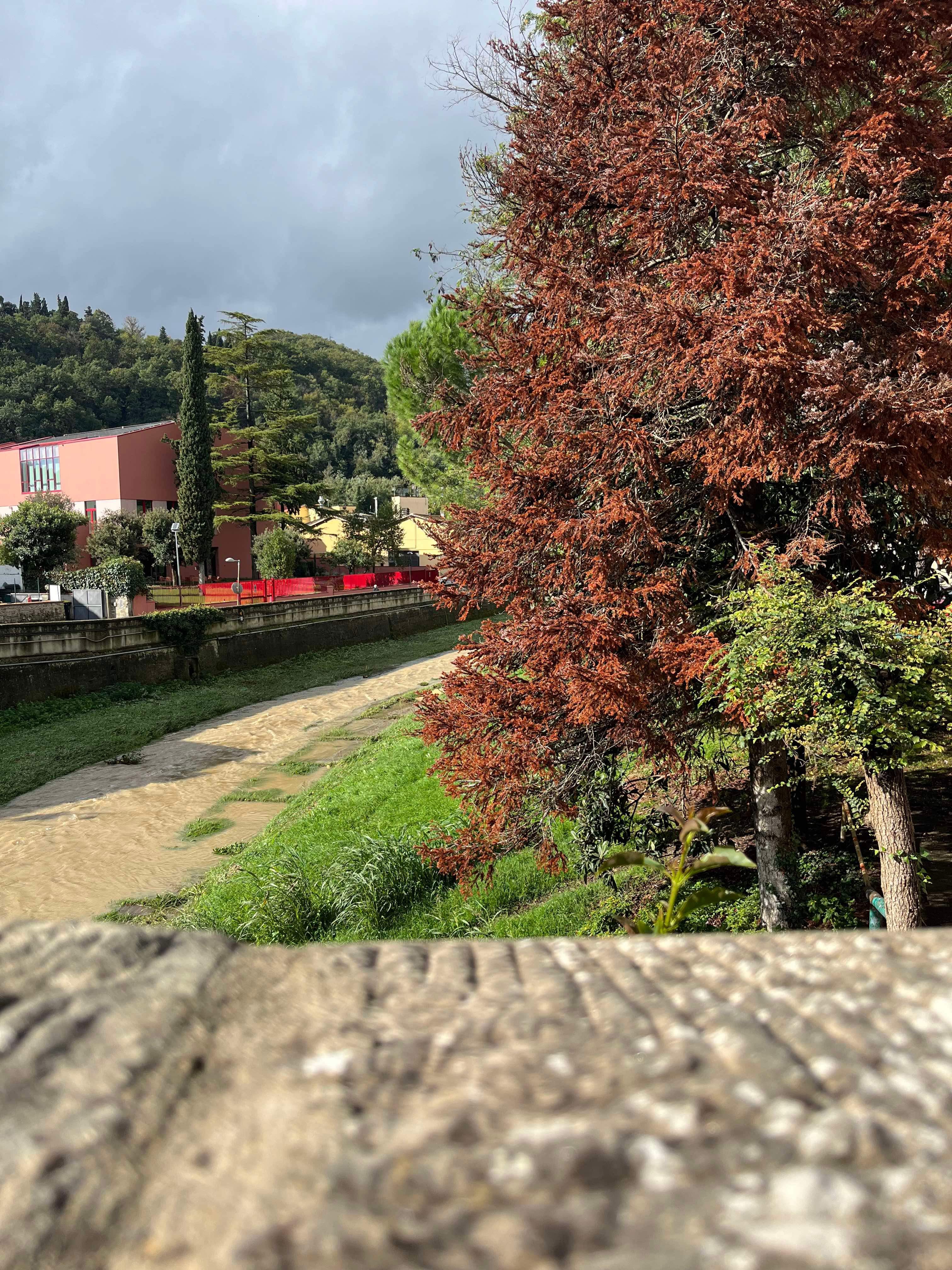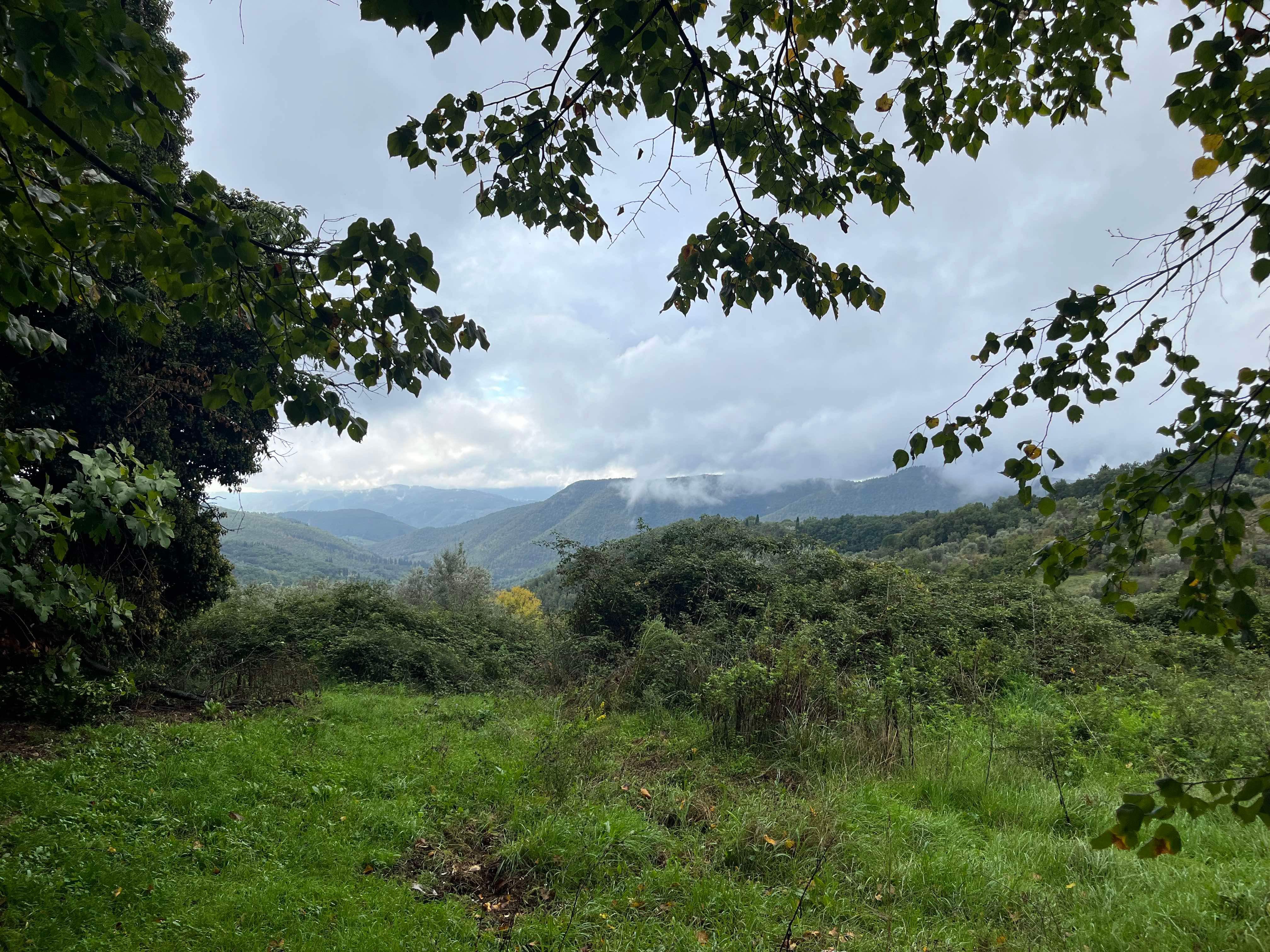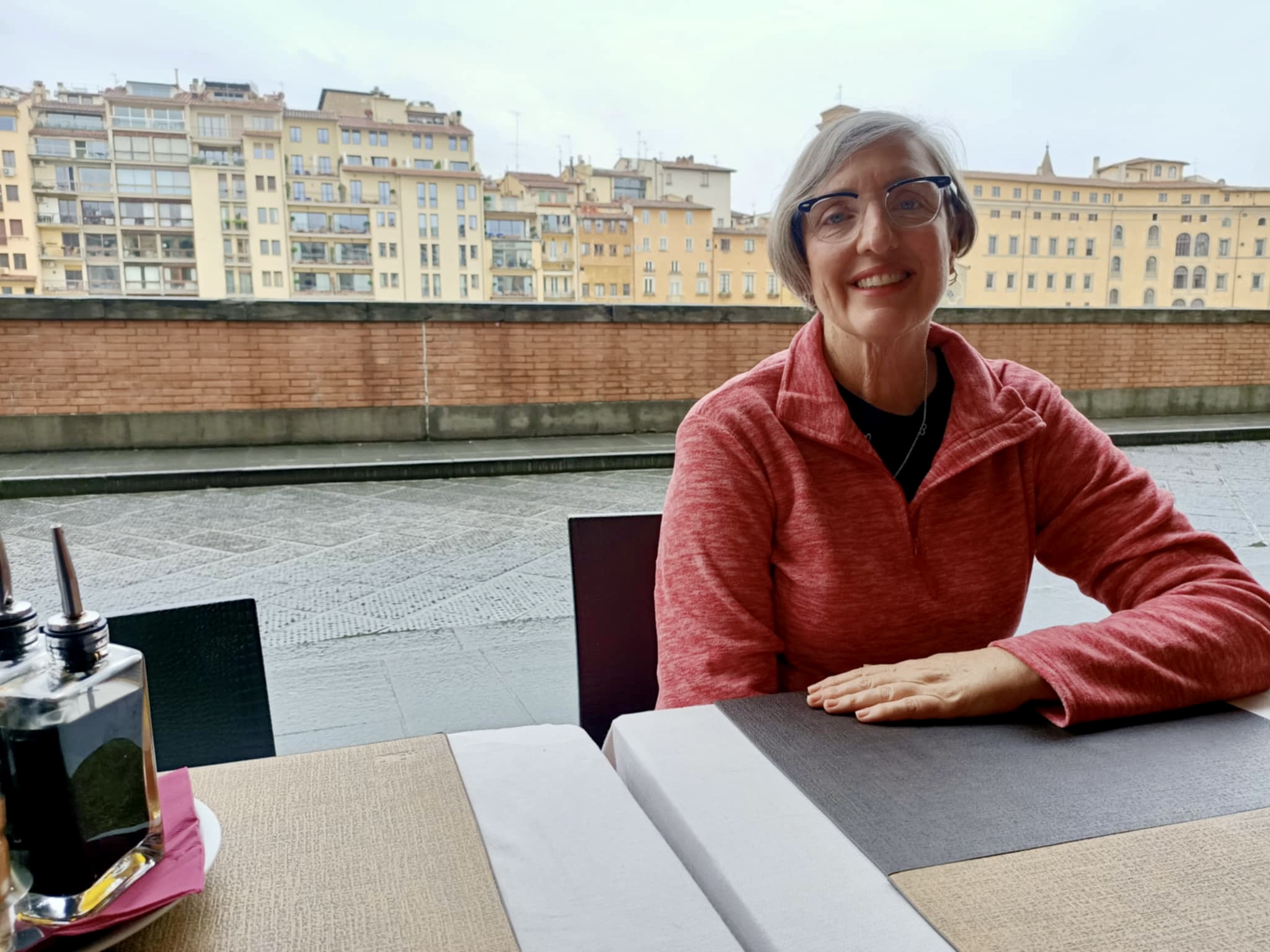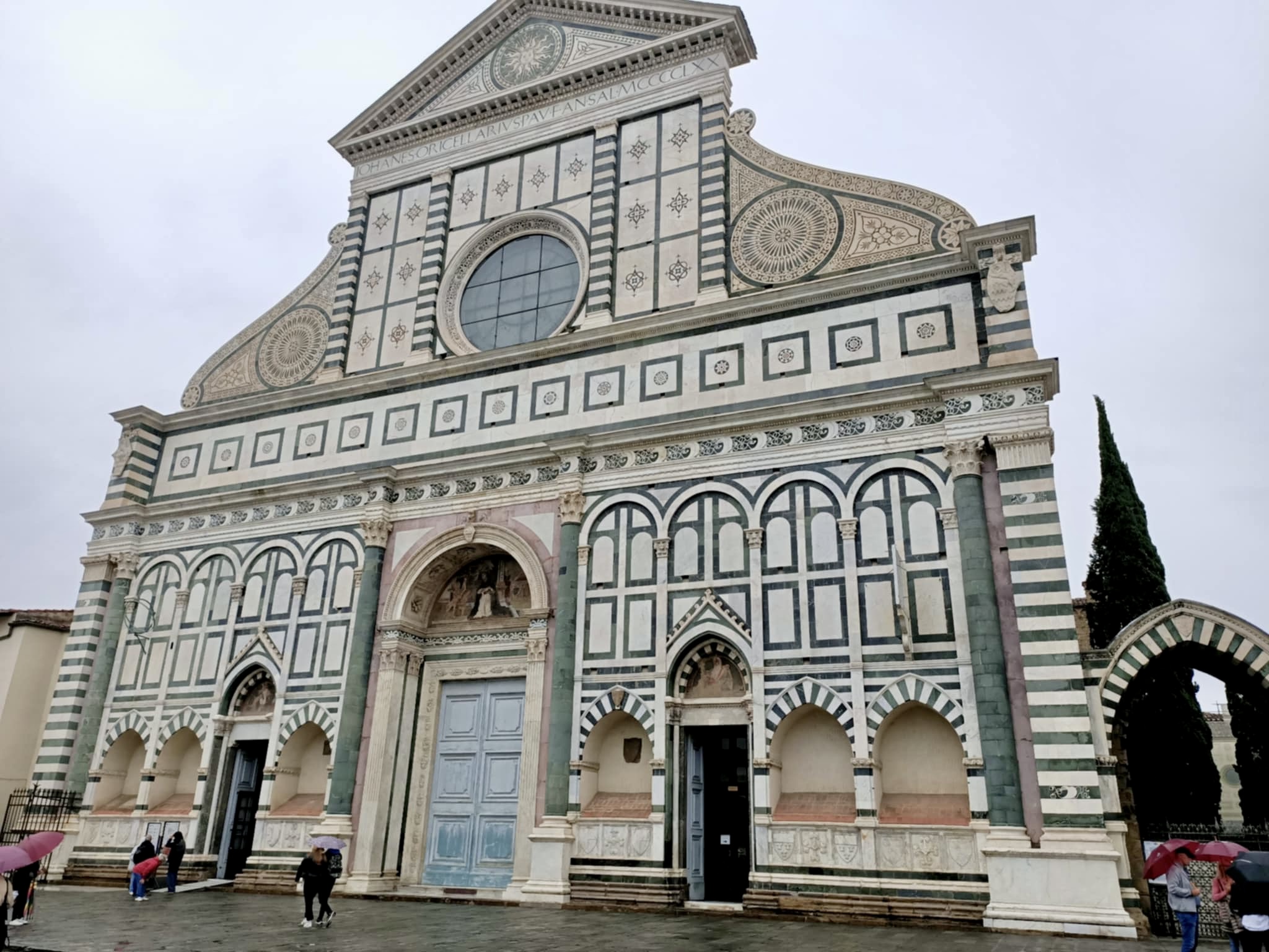 During our stay, we successfully attempted two day trips to Florence, catching the train from Sieci which was a 10 minute drive from our village. On our first day in Florence, we headed to the famous Ponte Vecchio which spans the Arno River. We had a basic (but expensive) lunch and walked across the bridge and then headed to the Michaelangelo Pallazo (the highest lookout in Florence). At this point in time, it was a bit drizzly, but not too bad. I had an umbrella, Rod had his waterproof jacket and Hamish had his puffy. I tried to share my umbrella with Hamish, but this was tricky on the narrow paths. The weather was 20-ish degrees, so we were sweaty as well as being rain drenched – such a lovely combination. Once at the lookout, there wasn’t much to see due to the grey skies, drizzle and cloud cover, so we looked for a toilet (it was closed) and then the heavens decided to really open up. We made our way into a very flash hotel for some afternoon tea and plan our escape back to Santa Brigida – no taxis, no buses…it was looking like we were going to have to walk in the pouring rain, but then at the last minute, a taxi dropped off a couple and we jumped in.
