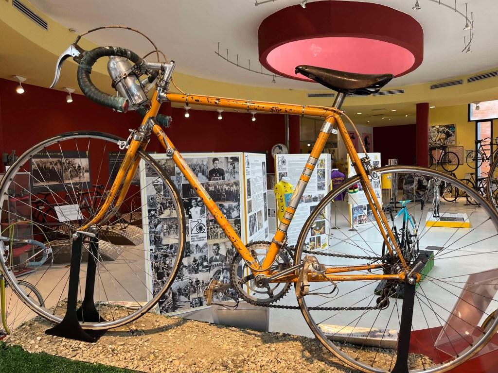 Gino Bartali Museum – earlier this year, my friend Trent (workmate and cycling aficionado) had loaned me a book about an Italian cyclist (Gino Bartali) who was a professional cyclist for 20 years, won two Tour de France races, 10 years apart, as well as two Giro d’Italia’s two years in a row. He also is perhaps less well known for his work for the Italian Resistance: carrying messages in his bike frame, hiding Jewish families, working with a priest in Florence to provide false documents and leading Jews to the Swiss Alps. As he was somewhat of a national treasure the Nazi’s were loathe to upset the general population, so left him, largely, to his own devices. He would ride in his racing jersey with his name on it, all in the name of ‘training’ – hiding in plain sight. His home town of Ponte a Ema was only a short drive from our village of Santa Brigida, so we visited the museum on our way to Lake Garda. The museum is only open on a few days, for a few hours, so the planets aligned for us! The museum is about cycling and the progression of bike technology, not about his resistance work, but it was very interesting for Rod and I. Bartali’s TdF winning bike was on display, as well as a few of his jerseys. Other Italian cyclists have jerseys and bikes housed there, such as Vincenzo Nibali – I could lift his bike with one finger! (Bertali’s bike on the other hand, is made of steel) and look at the size of that jersey! Incredibly privileged to be able to visit this museum.