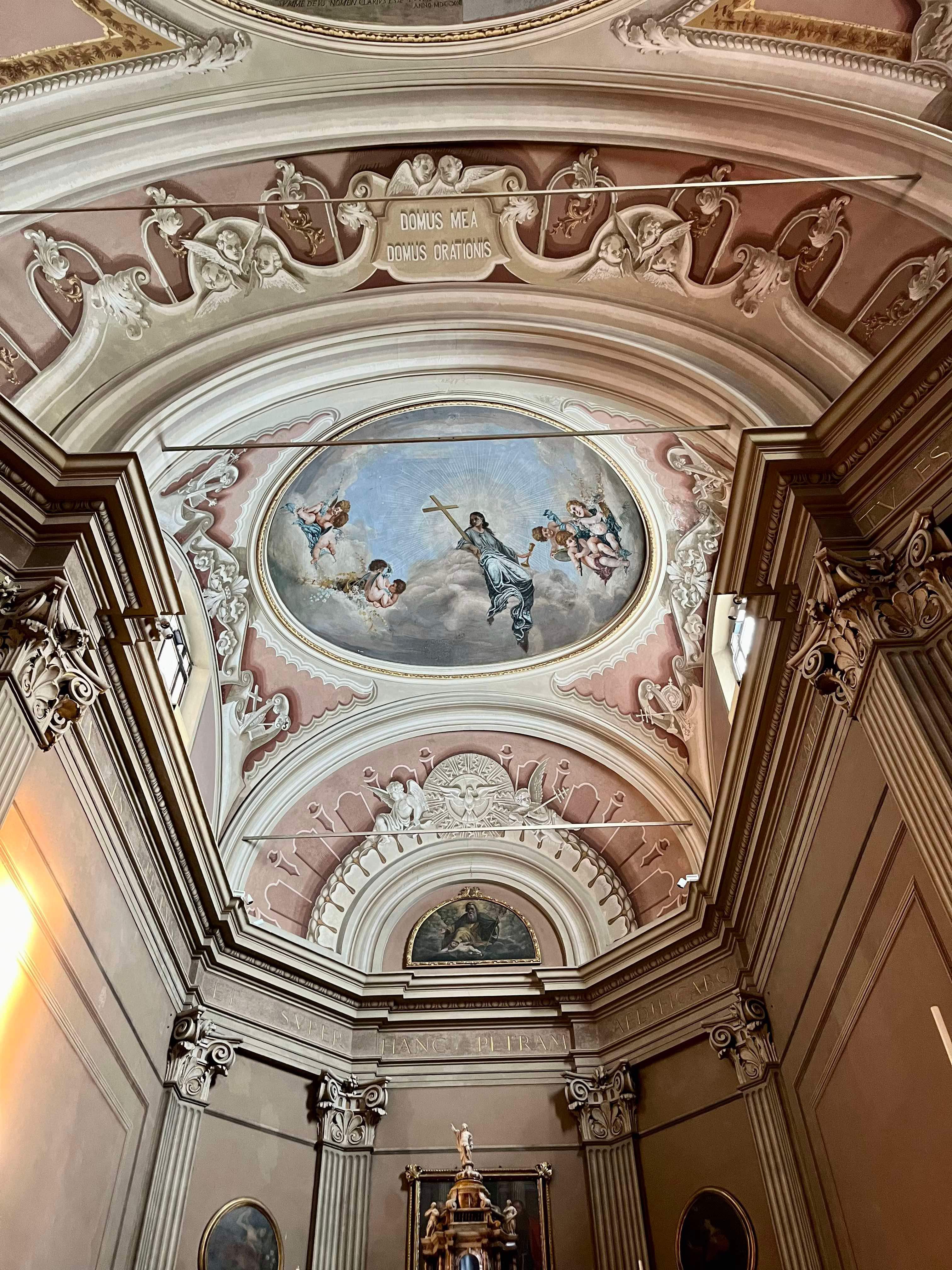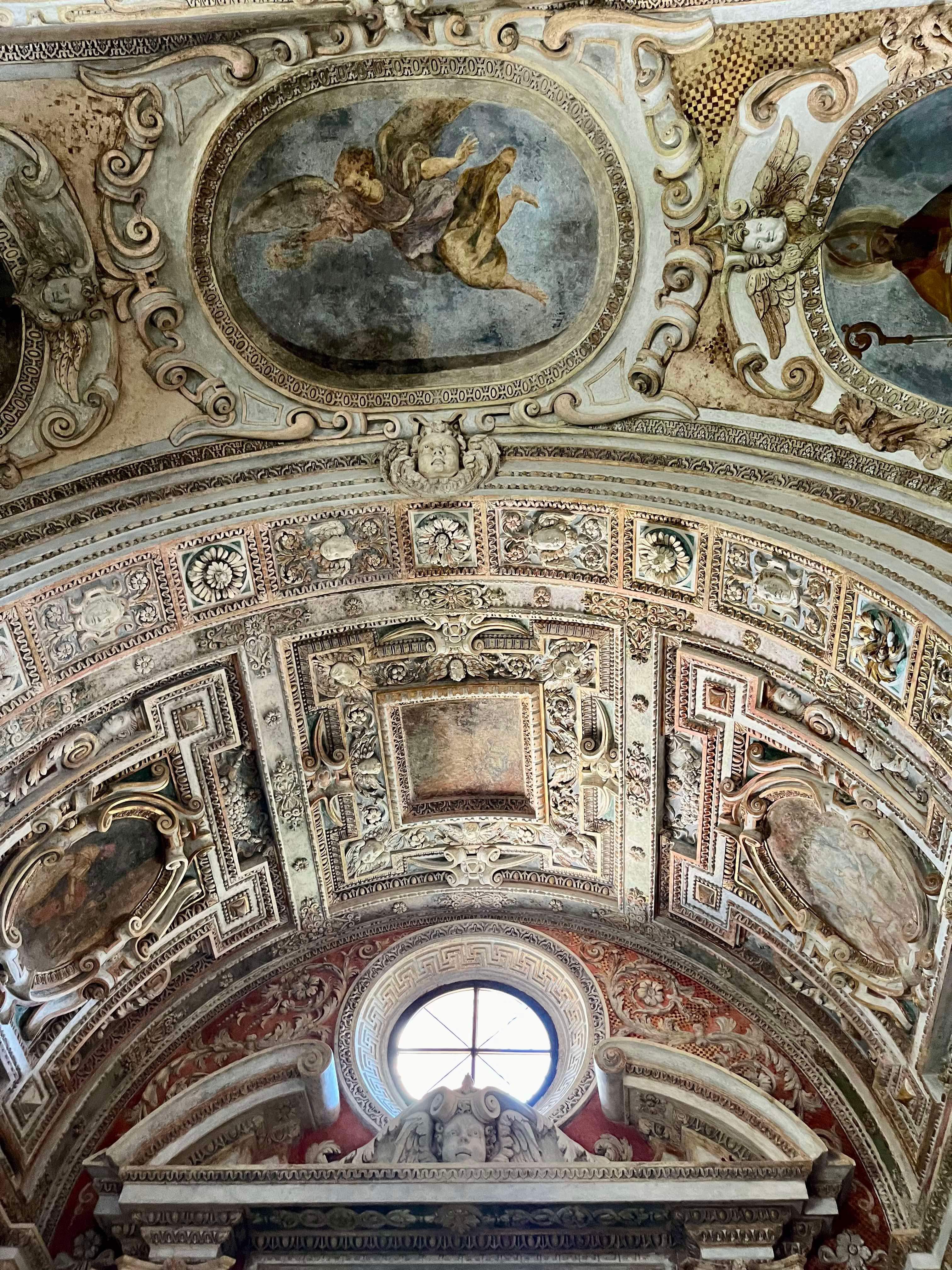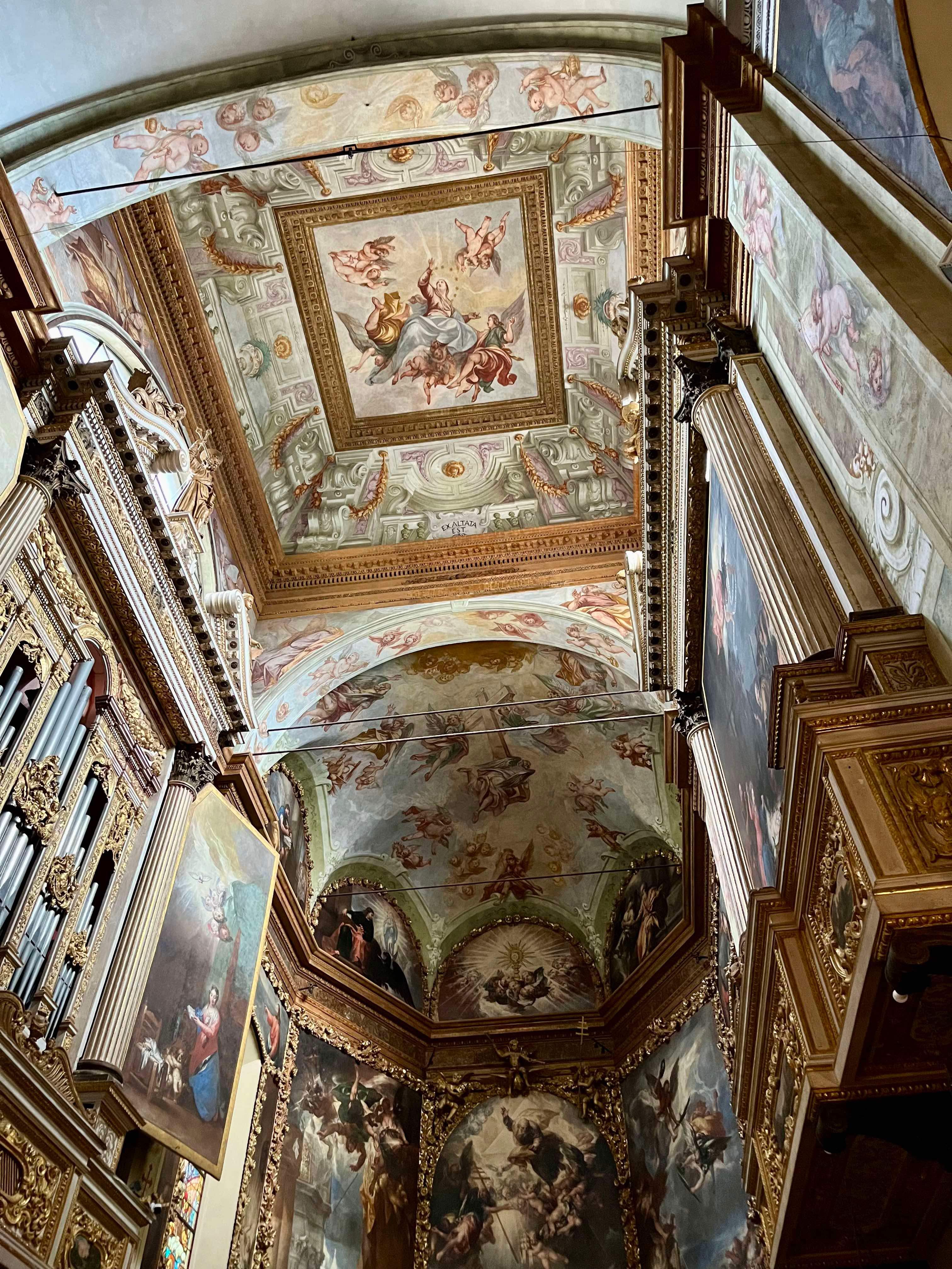 Sunday. The rain has finally eased off and Rod and I are keen to get out on foot and do some exploring. We are high up in the hills, about 150m above the waterline, but feel after all the steep steps, hills and walking we’ve done lately, we can surely walk into ‘town’ and back again. We mostly follow the narrow winding road and spot a landmark in the port area of Maderno. I set my phone navigation to that point. We find little walk throughs, to keep us off the road; they are sleek and slippery with the recent rains on top of the moss which has accumulated in the shady parts over the years. We are spat out into a little residential street which brings us directly to the front of the Church of Maderno. It was built in the 8th century, but upgraded to a Baptismal church in the 9th century (we don’t actually know what that means…). We walked in through the solid doors, worn smooth over the years with use, and looked around in amazement. Hamish has called these happenings ‘happy accidents’ where we accidentally find a little treasure. The church was incredible, with the added bonus of: no crowds, no queueing and no cost. It bore the same intricate designs and paintings that can be seen in the more well known churches.