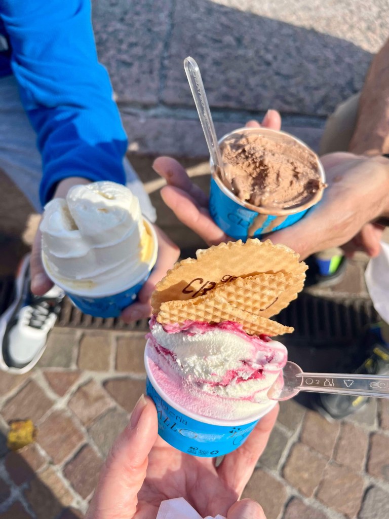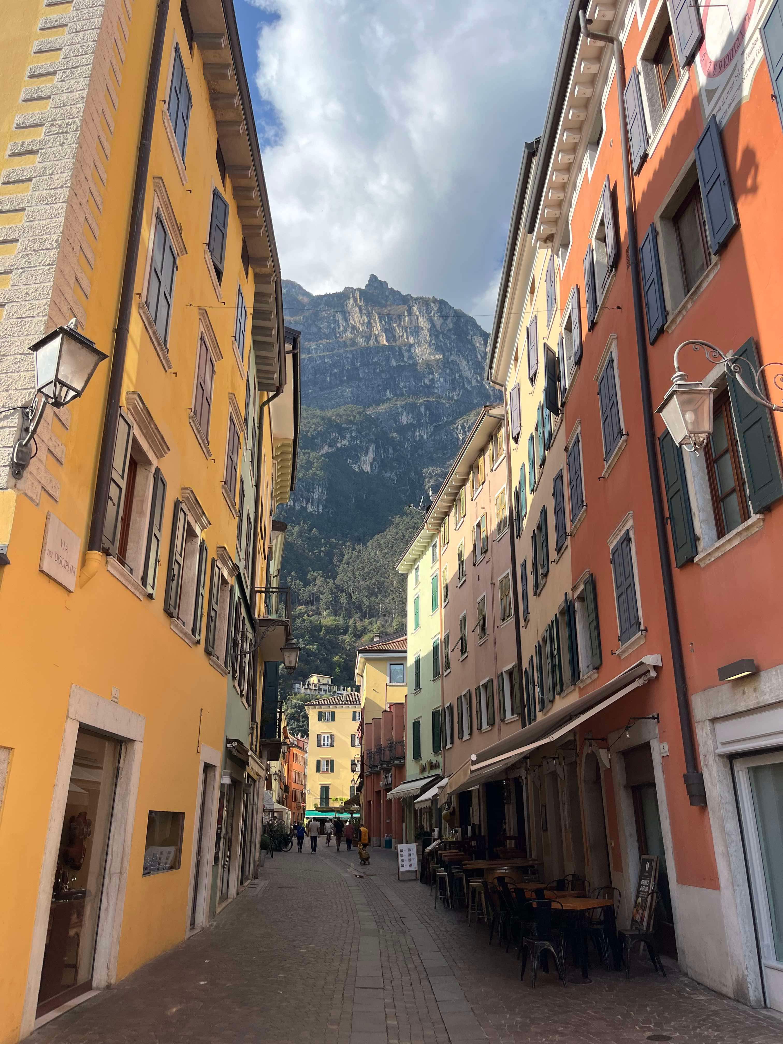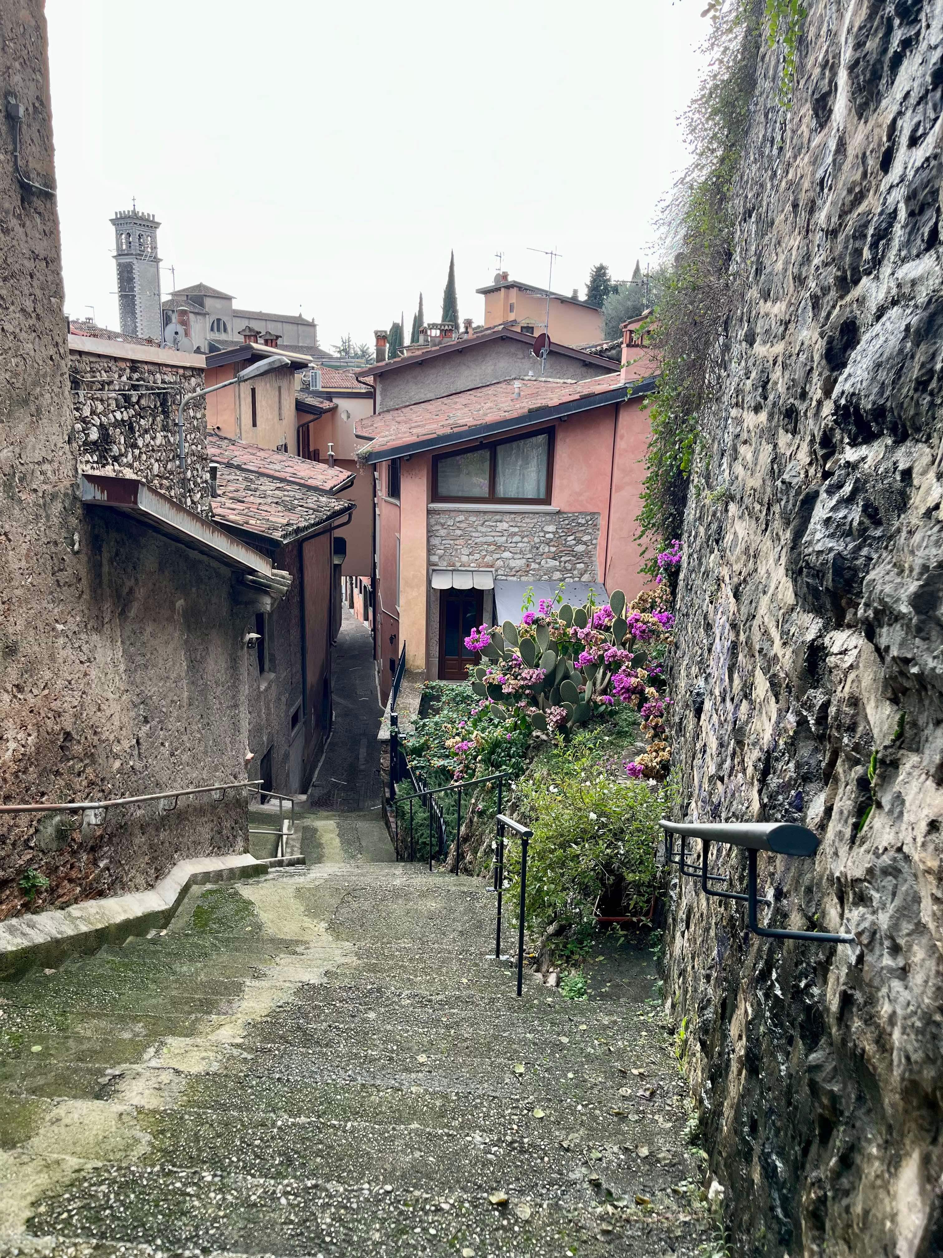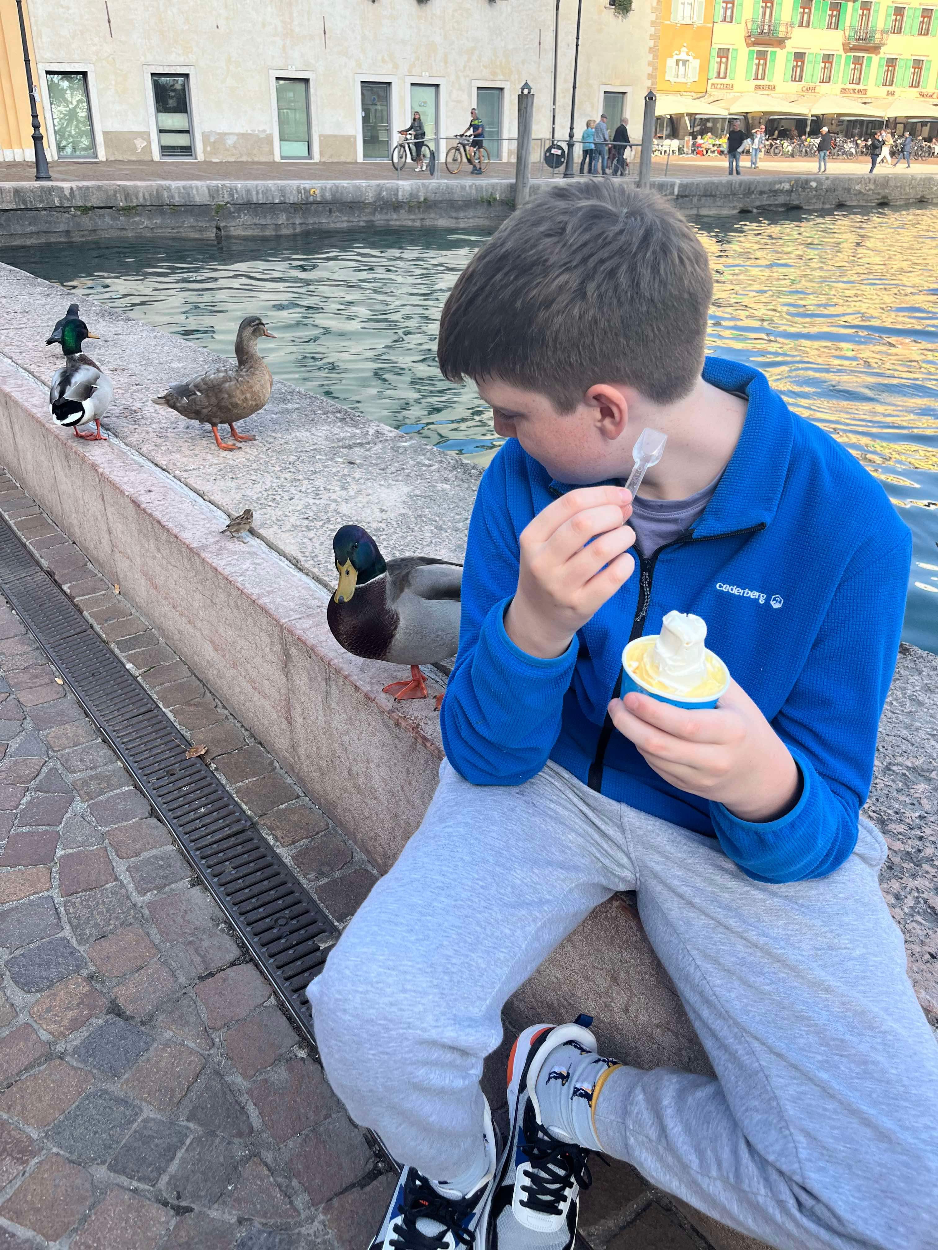 We eventually found a real car park (after Apple Maps suggested a car park existed in a school) and were rewarded with half a day set in the most beautiful waterfront surrounds. Pedestrian areas make life much easier and Riva mostly had car free zones. We found a little restaurant in a side street and had a light lunch (caprese salad, vegetable soup, lasagne and spaghetti with olive oil and chilli). We then caught a very steep funicular to visit the Bastione Di Riva (ye olde castle ruins). Fun fact: the funicular was finished just as COVID started. Prior to this there was a chair lift. Of course, gelato was in order after this excursion and you’ll be pleased to know I’m branching out, and getting out of my ‘but I only like vanilla’ phase and ordered some sort of cherry swirl which was to die for. The ducks were cute and very interested in hanging out with the people. How can anyone be grumpy when there’s gelato AND ducks!