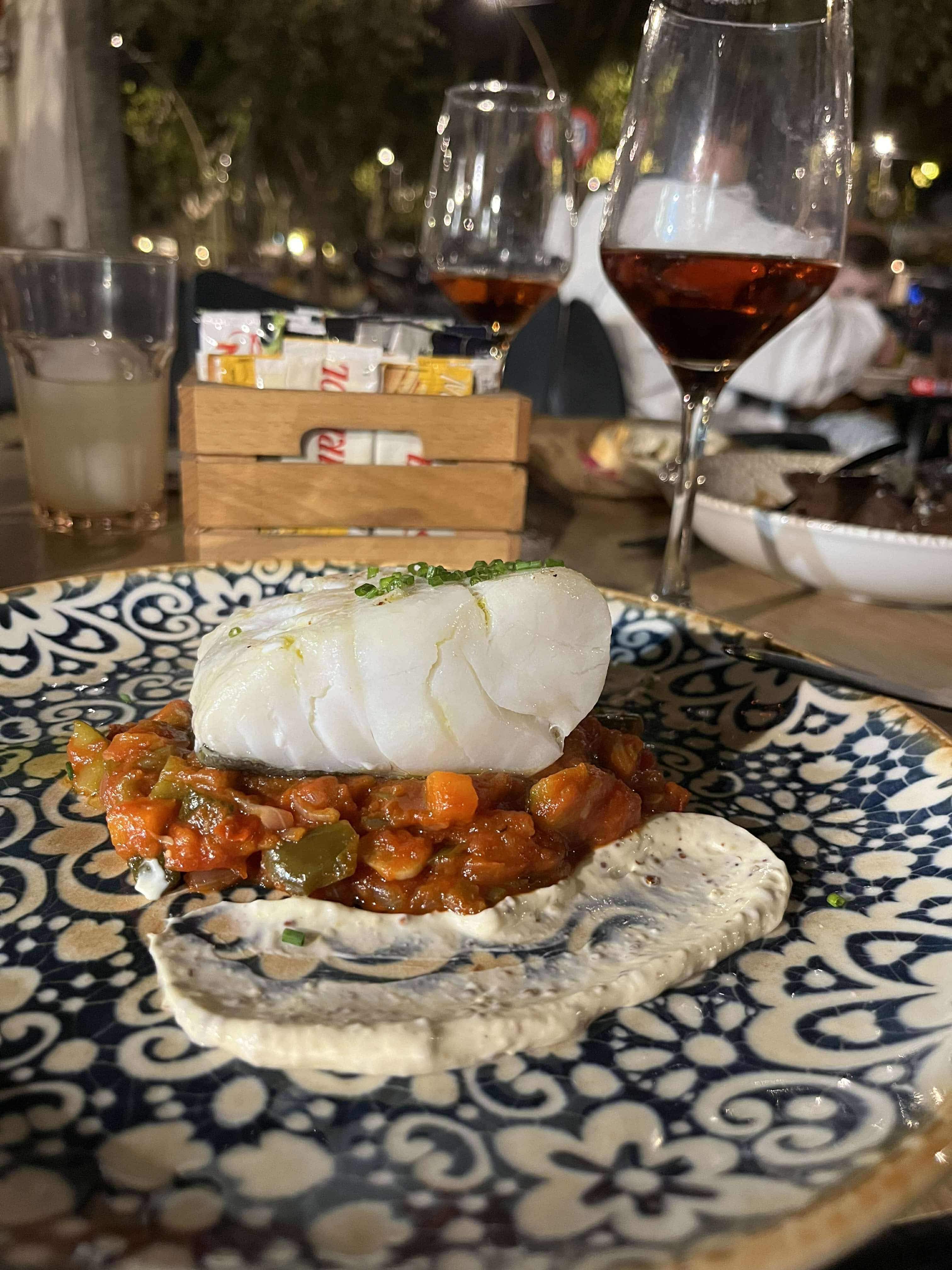 Our dinner does not disappoint with fresh fish (me), burger (Hamish) and a local traditional meal for Rod – stewed pork cheek.