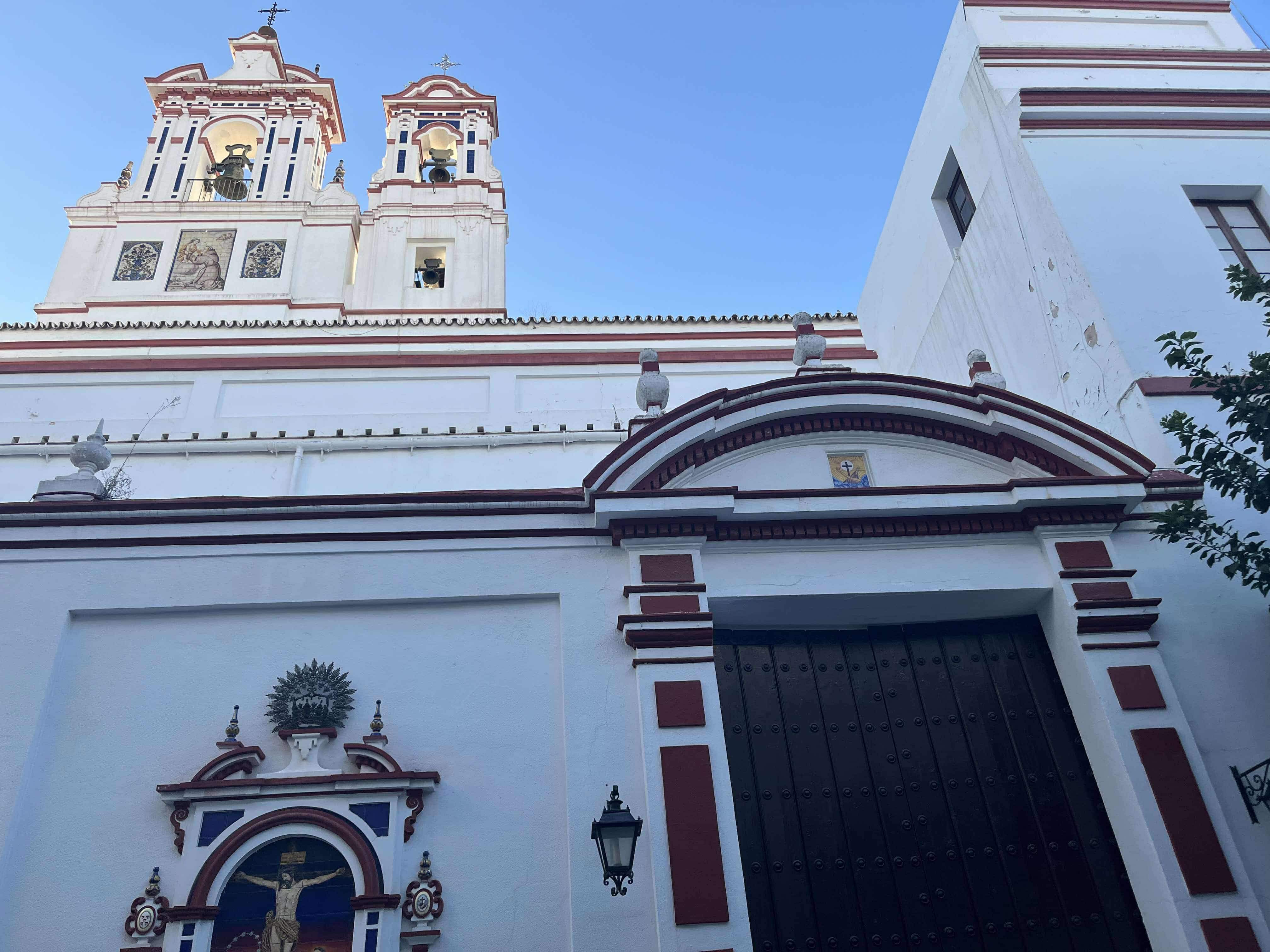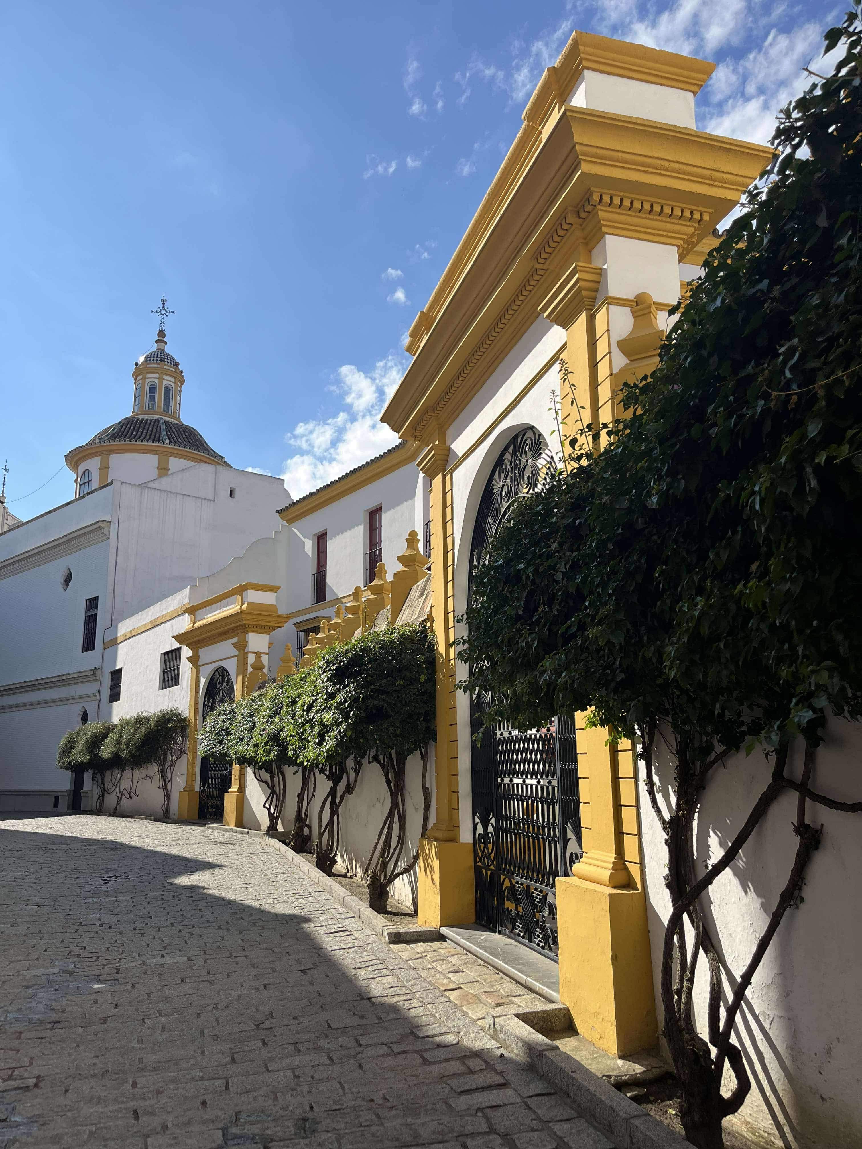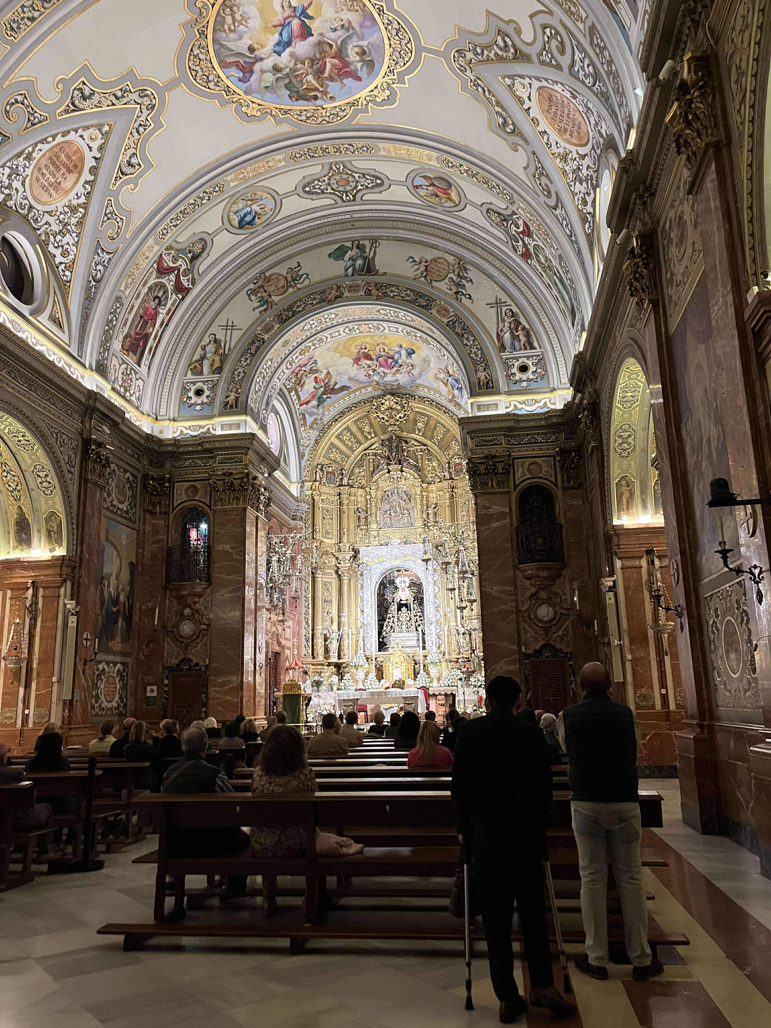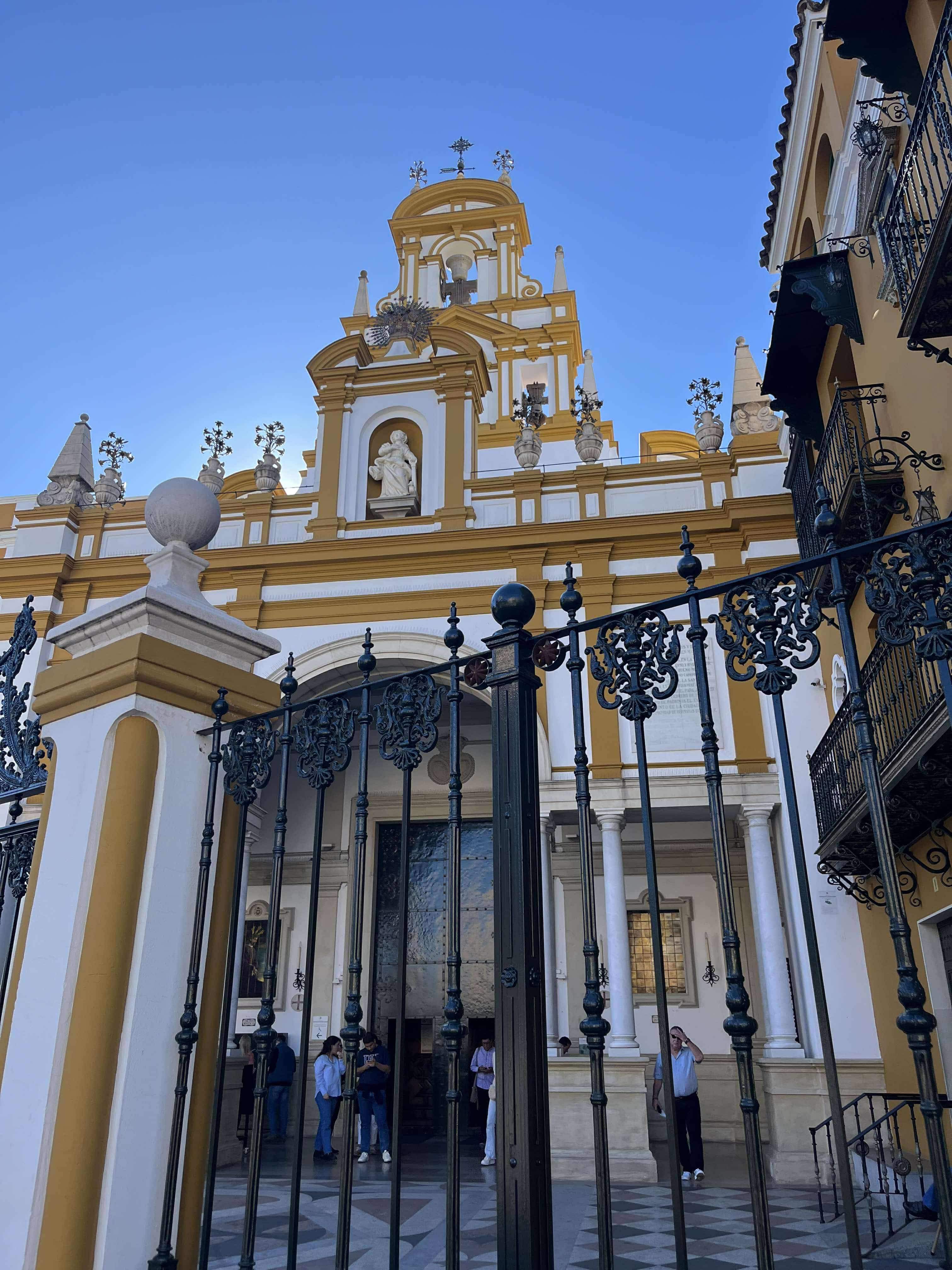 Hamish’s head cold has worsened overnight, but you’ll be pleased to know he was well enough to stay home on the couch and play games on his Switch. Rod has a plan that involves the two of us exploring the local area, so that if Hamish needs us, we’re close by. We find the Macarena Church, which is (free) incredibly ornate inside, the ancient city walls and the Parliament of Andalucia before we stop for a late morning tea. Andalucia is the name given to this province and the green and white striped flag is the Andalucian flag.