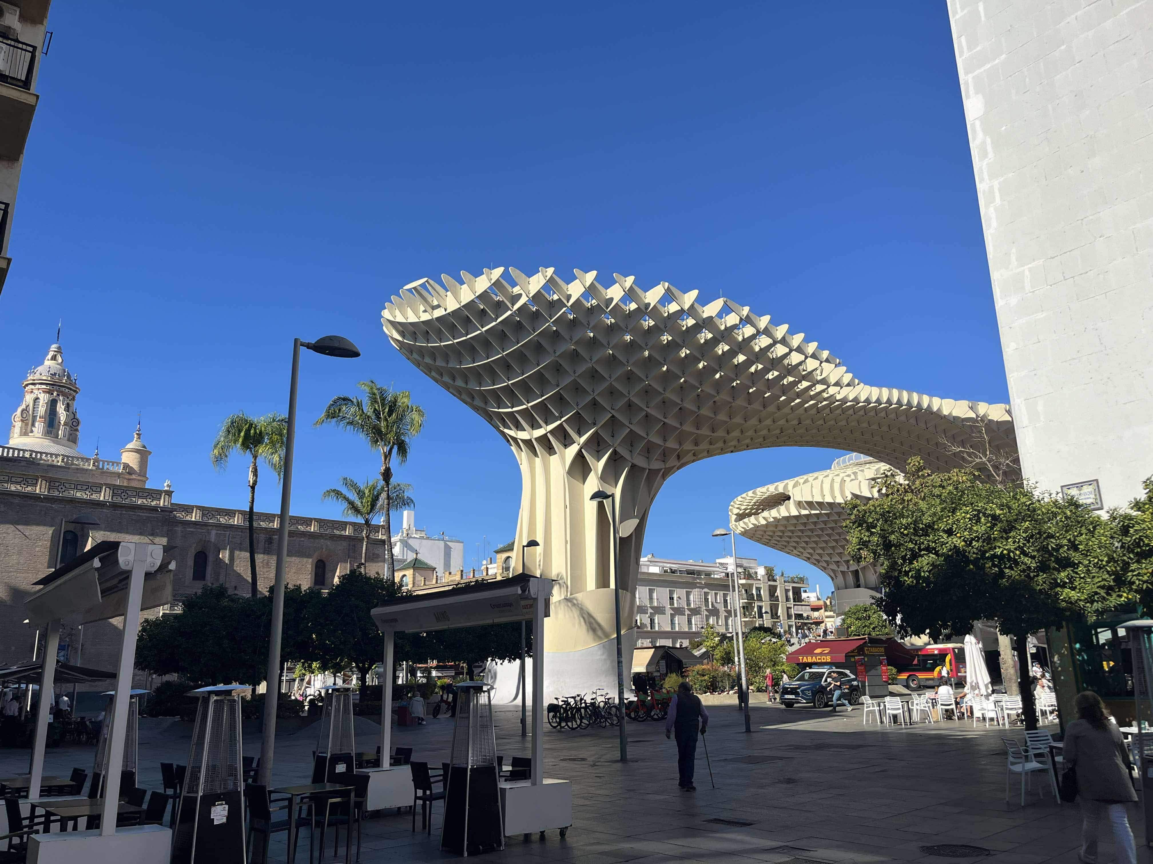 On our way back to the apartment we have stumbled across markets, each one dedicated to a different food type: fruit and vegetables in one, fish in another, meat and small goods in another, sweets/baked goods in another. We are sorry we’ve already done some grocery shopping; the tomatoes are rivalled only by Dad’s! Another accidental discovery on our way home is the Setas of Sevilla – the largest wooden structure in the world, affectionately called ‘The Mushroom’ here. You can pay to walk up top, but we wait to do this until Hamish is well (although he doesn’t get well in time and then the weather is against us!).