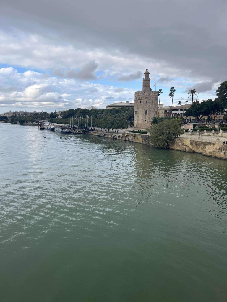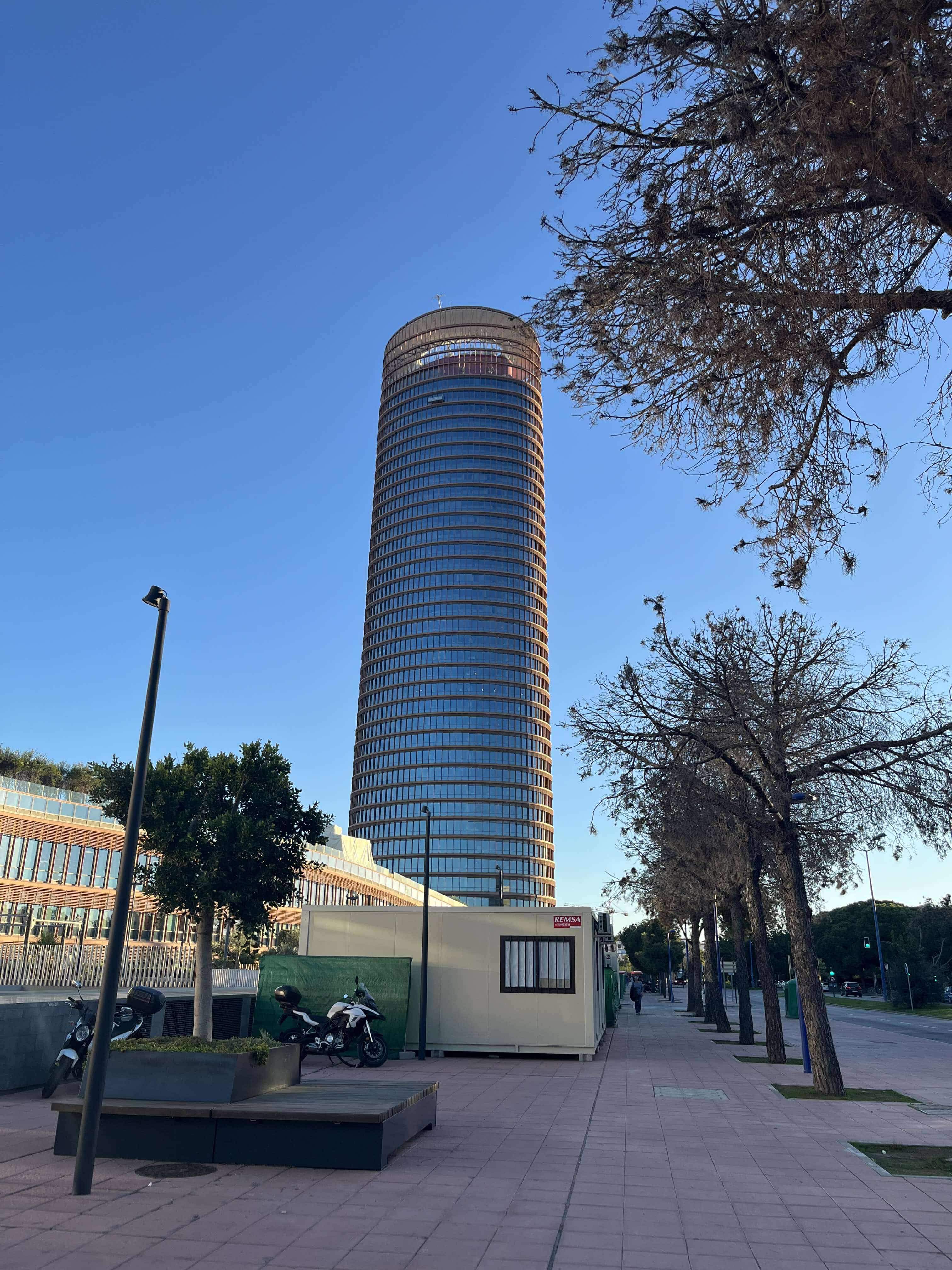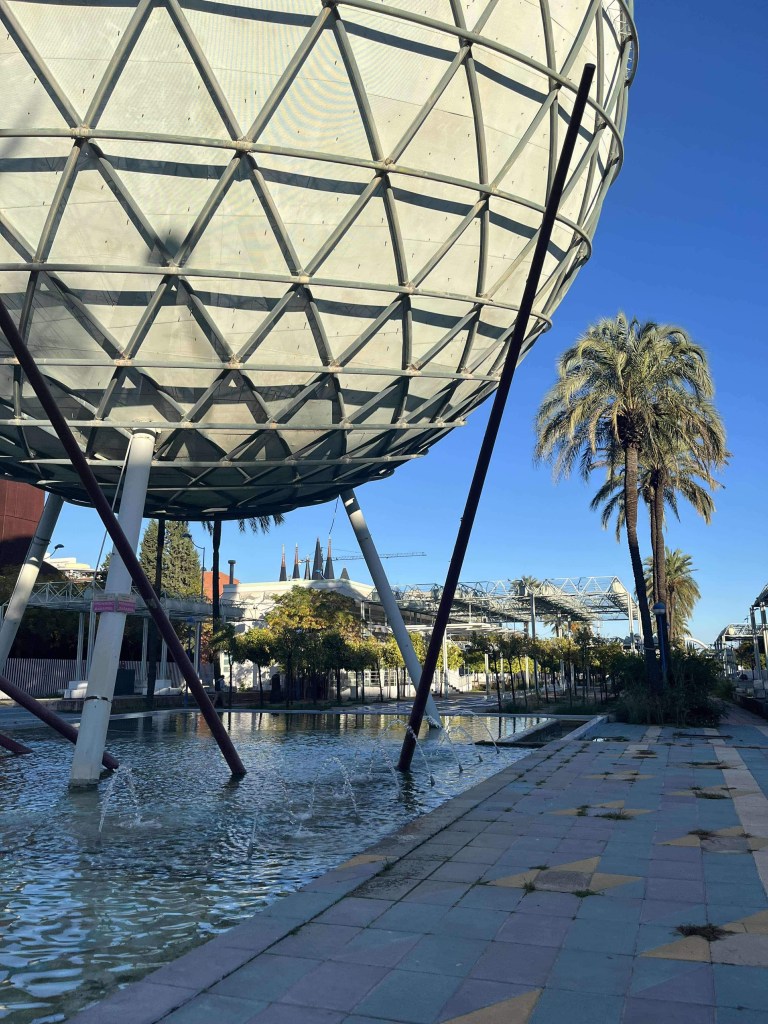 Once home, we all have lunch and a siesta. After this, Rod and I go out for an hour or so exploring the area on the other side of the canal near our apartment. The World Fair in 1992 was hosted here and there exists eerie relics, buildings and a water fountain, which we turn into an idea for a post apocalyptic movie as we walk along. There’s barely anyone around, save for a couple of people on scooters and a handful of cars, but plenty of empty buses cruising by. We navigate back home via the Tower of Sevilla, whose modern design looks out of place in our movie set.