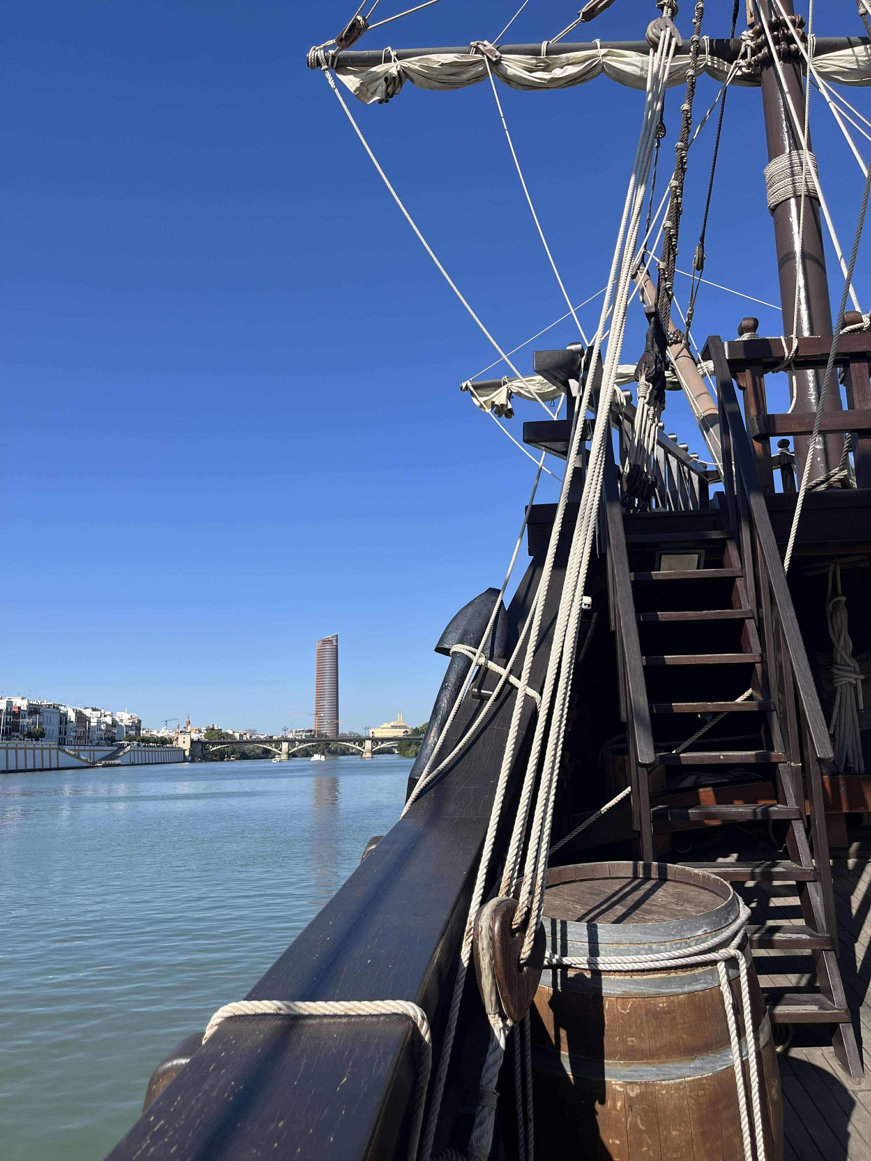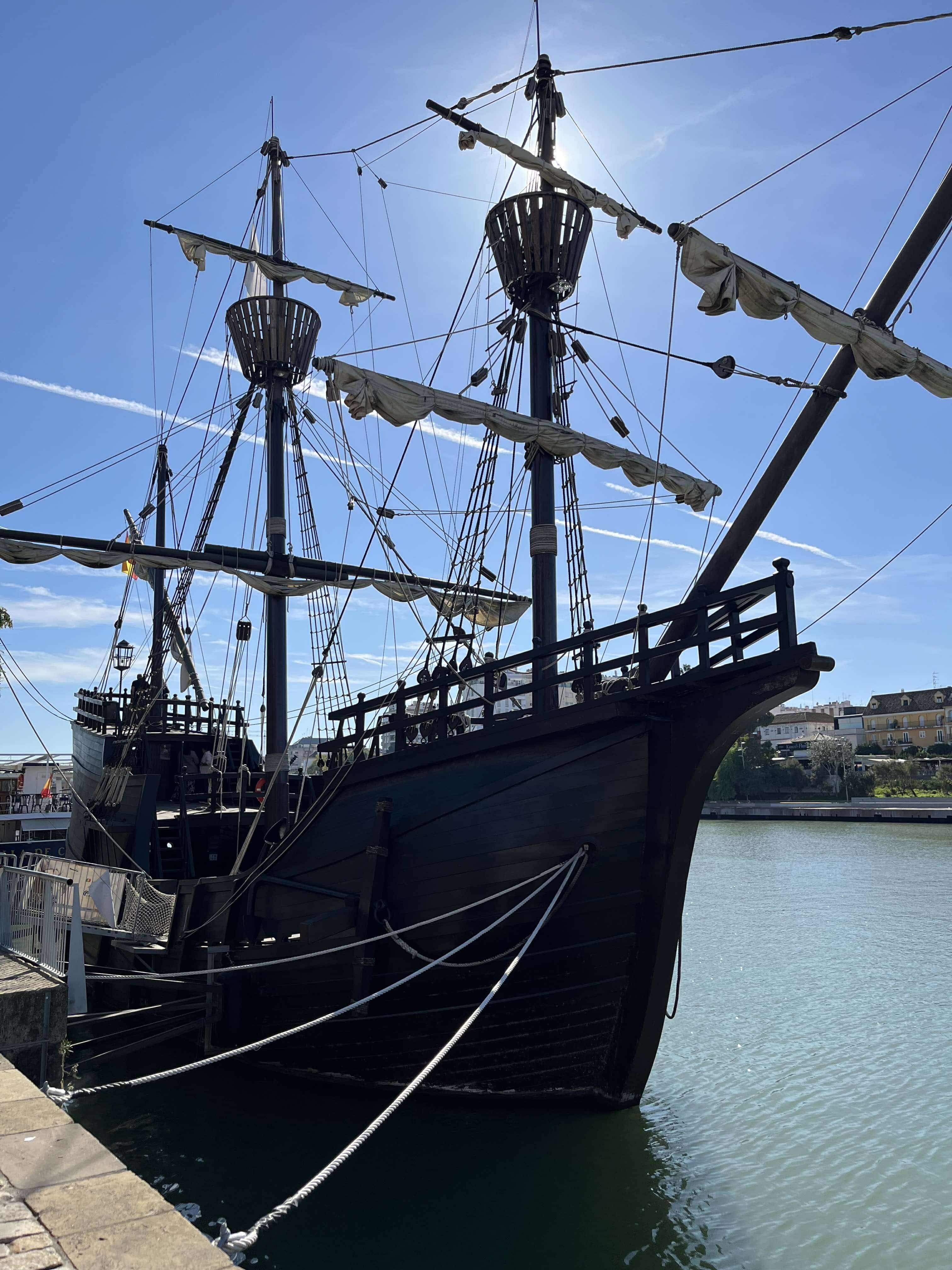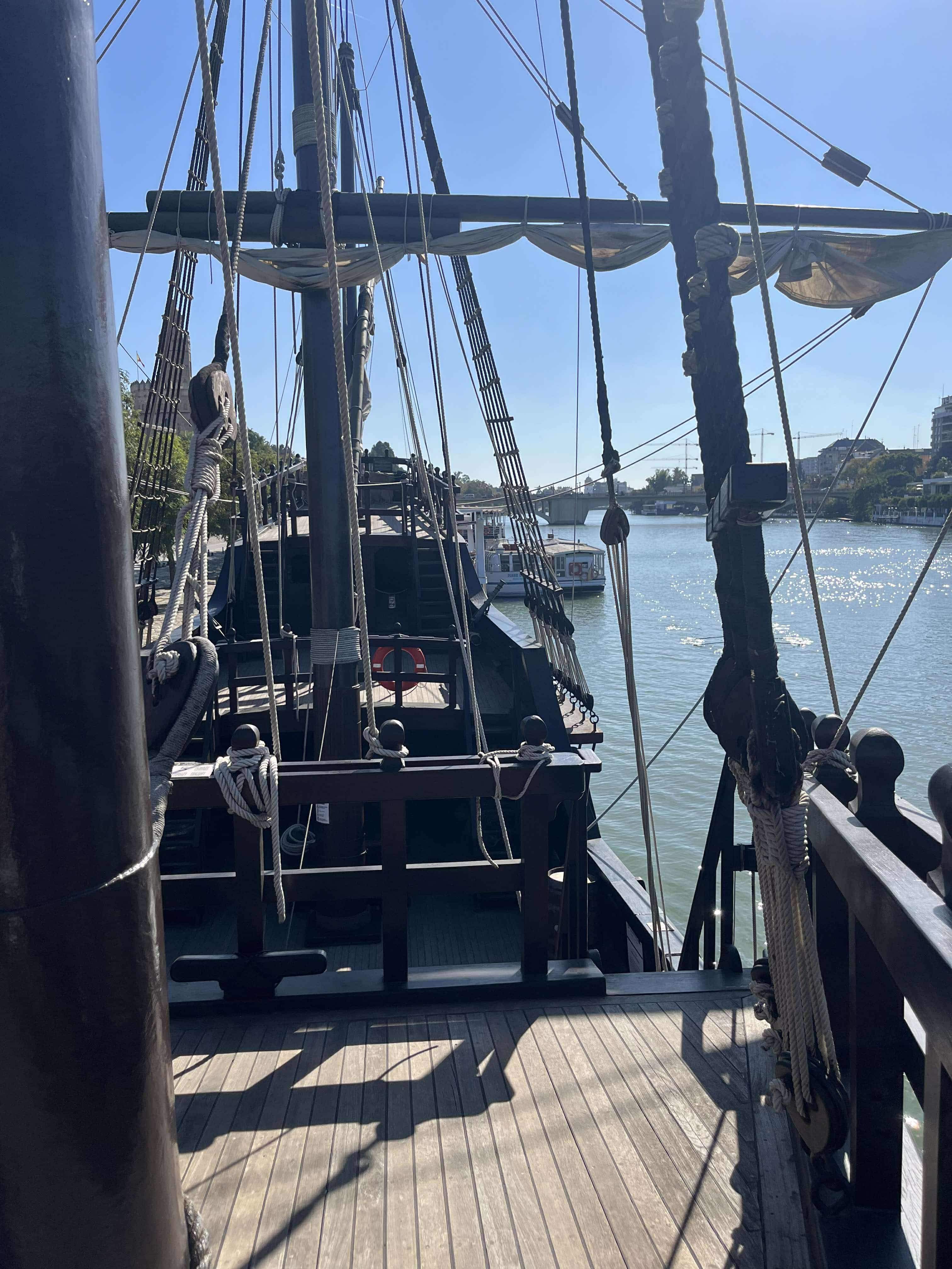 With Hamish still under the weather, we leave him on the couch (with a ready made baguette in the fridge) and head to the Nao Victoria museum. This place is designed to celebrate both the first vessel to successfully circumnavigate the globe and the skipper of the fleet – Ferdinand Magellan. Whilst it does not make Tripadvisor’s “top 25” things to do in Sevilla it certainly captures our imagination! A mixture of relics, videos, photos, etc. paints a vivid picture of this epic and incredibly significant voyage. Of the five ships and (about) 270 crew who started the trip, only 1 ship (Victoria) and 18 crew made it back to Sevilla. (Magellan met a violent death in The Philippines; trying too hard to convert the locals to Christianity is a dangerous pastime.) The tour is completed with a thorough inspection of the rebuilt Victoria berthed in the canal, just outside the front door of the museum. Our minds struggle to comprehend the hardships they must have faced living in these cramped and often miserable surrounds.