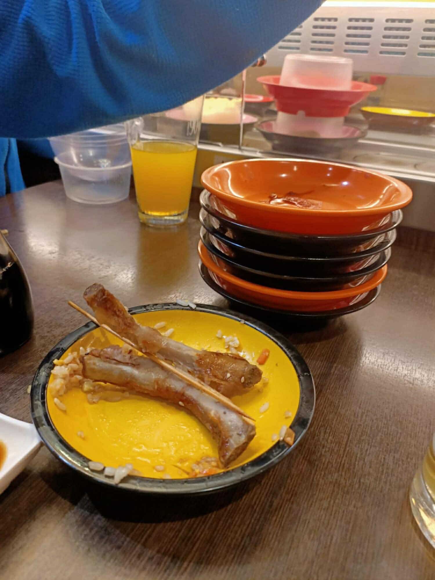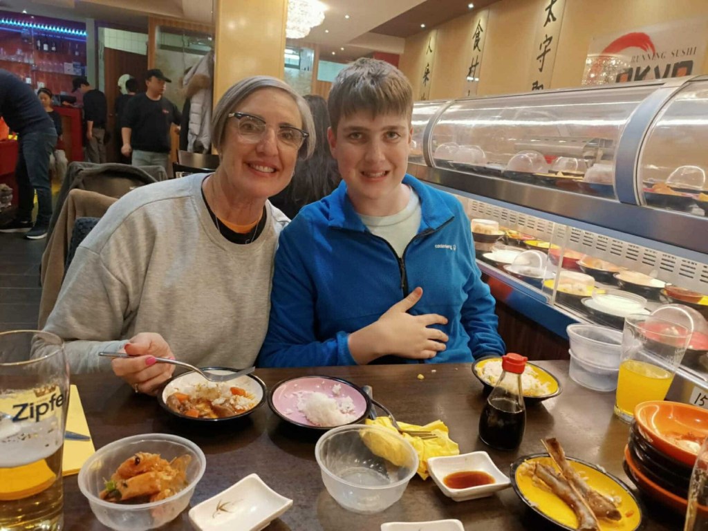 Our apartment was in walking distance to the main city centre this week so again, we have not bothered with public transport. Once unpacked, we found a sushi train restaurant for dinner. I have never had this eating experience before, but Hamish has. Rod ordered a dish from the menu, but Hamish and I were excited to try the many samples of hot, cold, sweet and savoury dishes on offer. For reference, the plates are about the size of a saucer, or a small side plates: Hamish had 16 plates I had 8. We had dishes such as: steamed rice, fried rice, prawn stir fry, pork ribs in plum sauce, honey chicken, sushi, sashimi and a mini muffin/cake. The beer I ordered was 500ml – you really have to commit to a beer here!