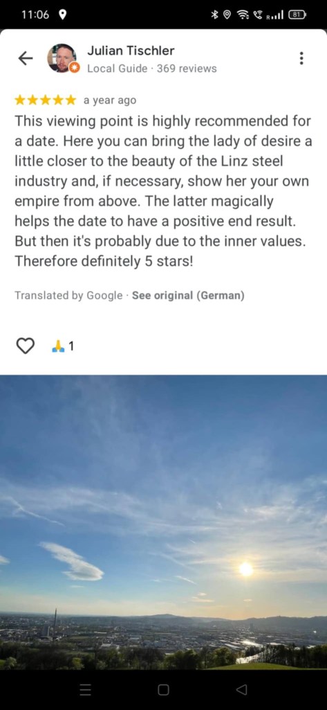 And one more thing, whilst looking for things to discover in Linz, Rod found this review of a lookout over the powerplant. Best review ever.