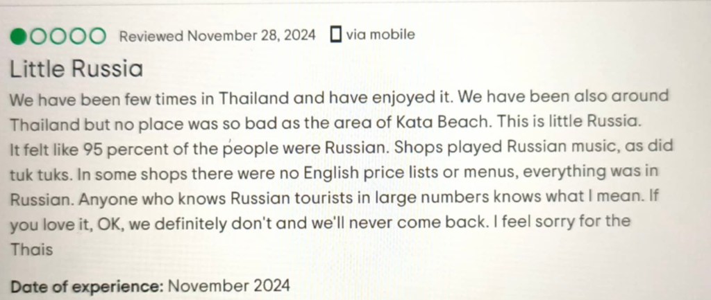 A side note about Russians. I have read there were over 1 million Russians to visit Phuket last year – the largest nationality to visit. Many now live here since the invasion of Ukraine. We noticed this 18 months ago when we were here, but it has really ramped up since then. We have pro-Ukraine t-shirts but I feel this type of provocation may only get us in trouble – I am sorry we are not brave enough to wear them. It is rare I hear an English, Aussie or American accent. This island is definitely set up to cater for Russians; some restaurants even have a section in their menu “Russian Foods”. I’m going to make a big generalisation here – the Russian tourists can be quite rude and demanding when interacting with the quiet Thai’s. At the beach, one Russian man walked up to the beach bar, didn’t wait his turn, called out his order, threw his money at the staff and said, “Bring them to me – I am over there”. I mean, the staff do this anyway, no need to have the attitude. And yes, I know, there are plenty of rude people around from plenty of different countries, but it’s the sheer number of Russian tourists here that amazes me. Ukrainians can’t leave their country, why should Russians be allowed to do whatever they like?